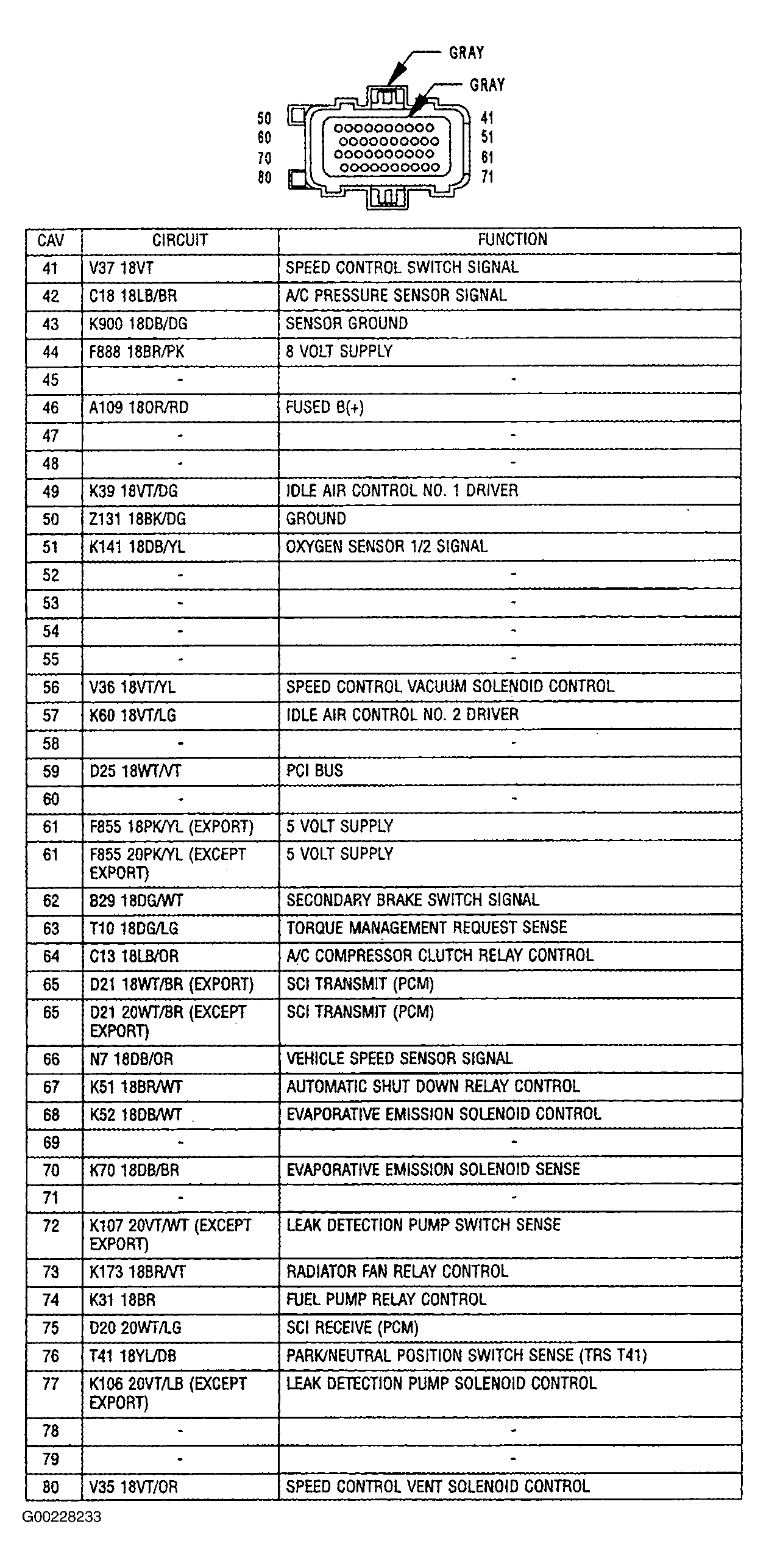 - Turn ignition on. Using a test light connected to ground, probe terminal No. 20 (Pink/Gray wire) at PCM C1 harness connector. See Fig 4 . If test light illuminates brightly, power circuits are okay. Go to next step. If test light does not illuminate brightly, repair open fused ignition switch output circuit (Pink/Gray wire) between PCM and IPM.