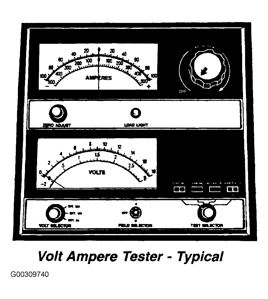- Rotate and hold the ignition switch in the Start position. Note the cranking voltage and current (amperage) draw readings shown on the volt-ampere tester.