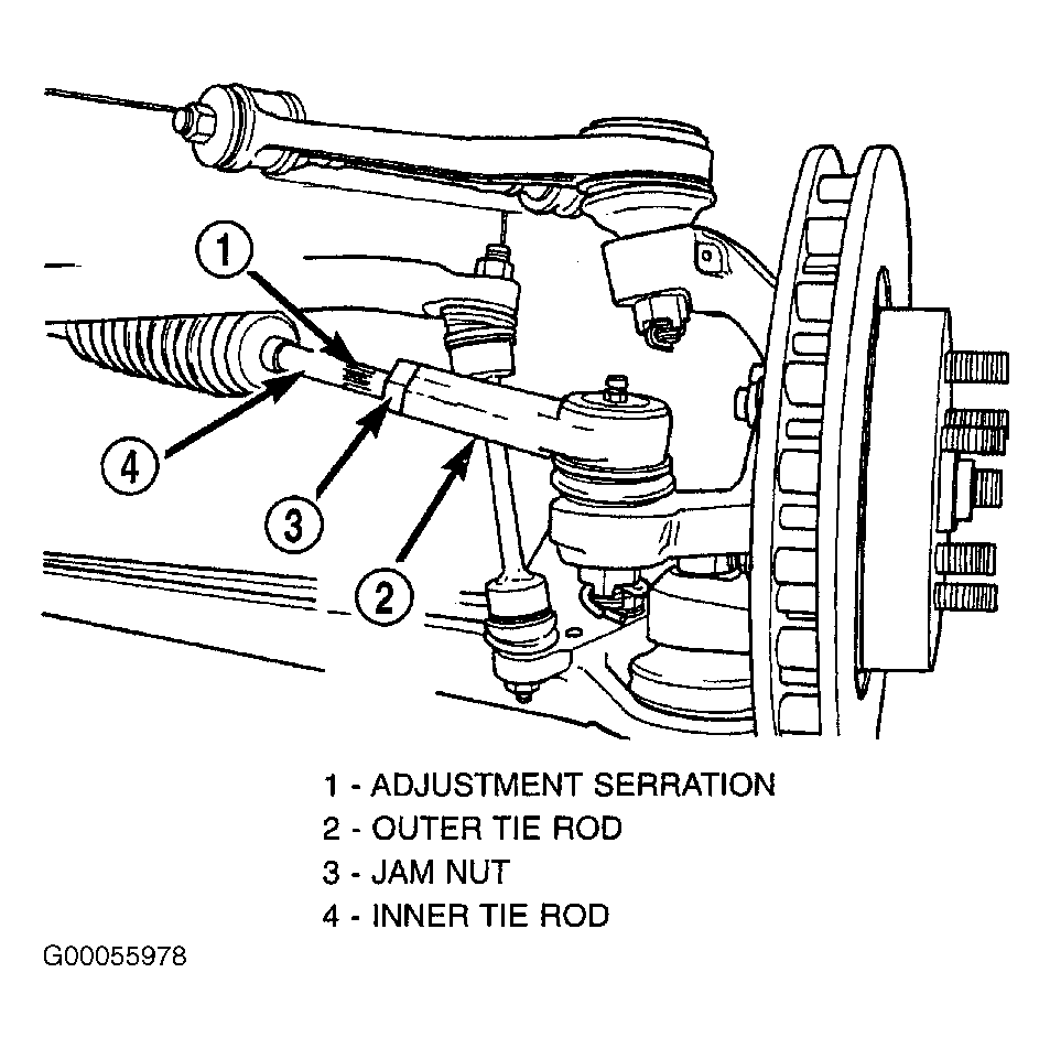 - Grasp inner tie rod at adjustment serration. See Fig 1. Rotate inner tie rod in direction required to obtain specified individual wheel toe position. Perform adjustment at each wheel as needed. For wheel alignment specifications, see Figure. Tighten inner tie rod to outer tie rod jam nut to specification. See TORQUE SPECIFICATIONS .