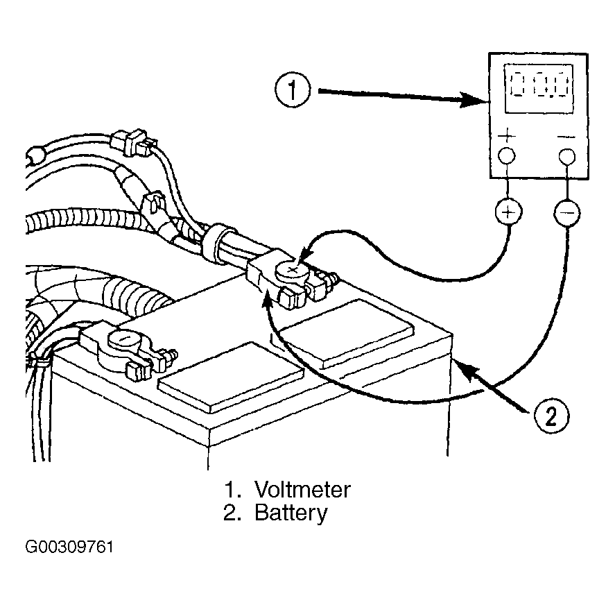- Connect the positive lead of the voltmeter (1) to the battery (2) negative terminal post. Connect the negative lead of the voltmeter (1) to the battery (2) negative cable clamp. Rotate and hold the ignition switch in the Start position. Observe the voltmeter. If voltage is detected, correct the poor contact between the cable clamp and the terminal post. See Fig 1 .