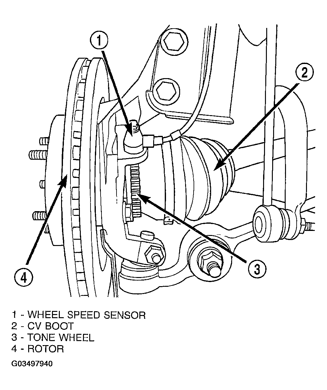 This system uses two-wire wheel speed sensors known as active wheel speed sensors. One wheel speed sensor (WSS) and one tone wheel is located at each front and rear wheel. Each front wheel speed sensor is attached to a boss in the steering knuckle (Fig 1 ). The front tone wheel is part of the outboard constant velocity joint.
