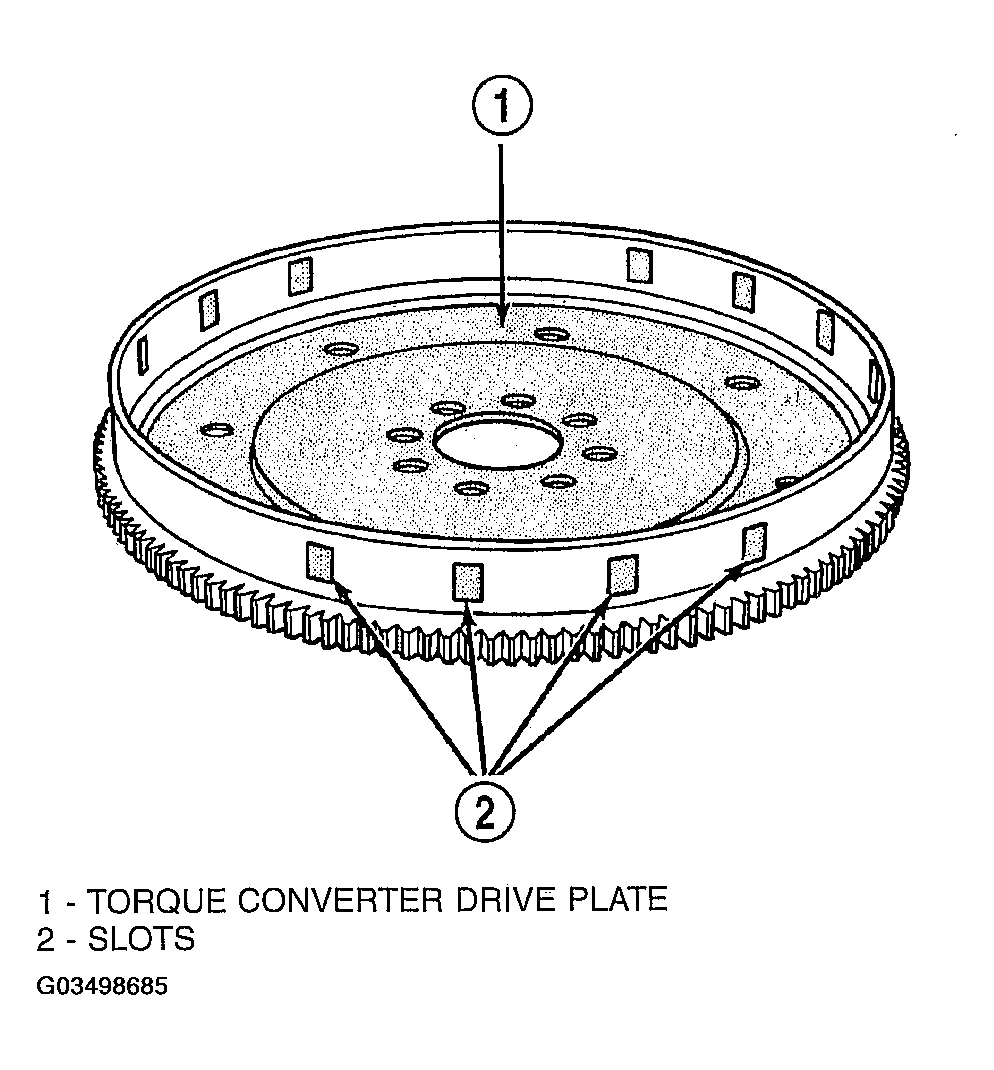 The crankshaft position sensor detects slots cut into the transmission driveplate extension. There are 3 sets of slots. Two sets contain 4 slots and one set contains 5 slots, for a total of 13 slots (Fig 1). Basic timing is set by the position of the last slot in each group. Once the Powertrain Control Module (PCM) senses the last slot, it determines which piston will be next at TDC from the camshaft position sensor input. It may take the PCM one engine revolution to determine crankshaft position.