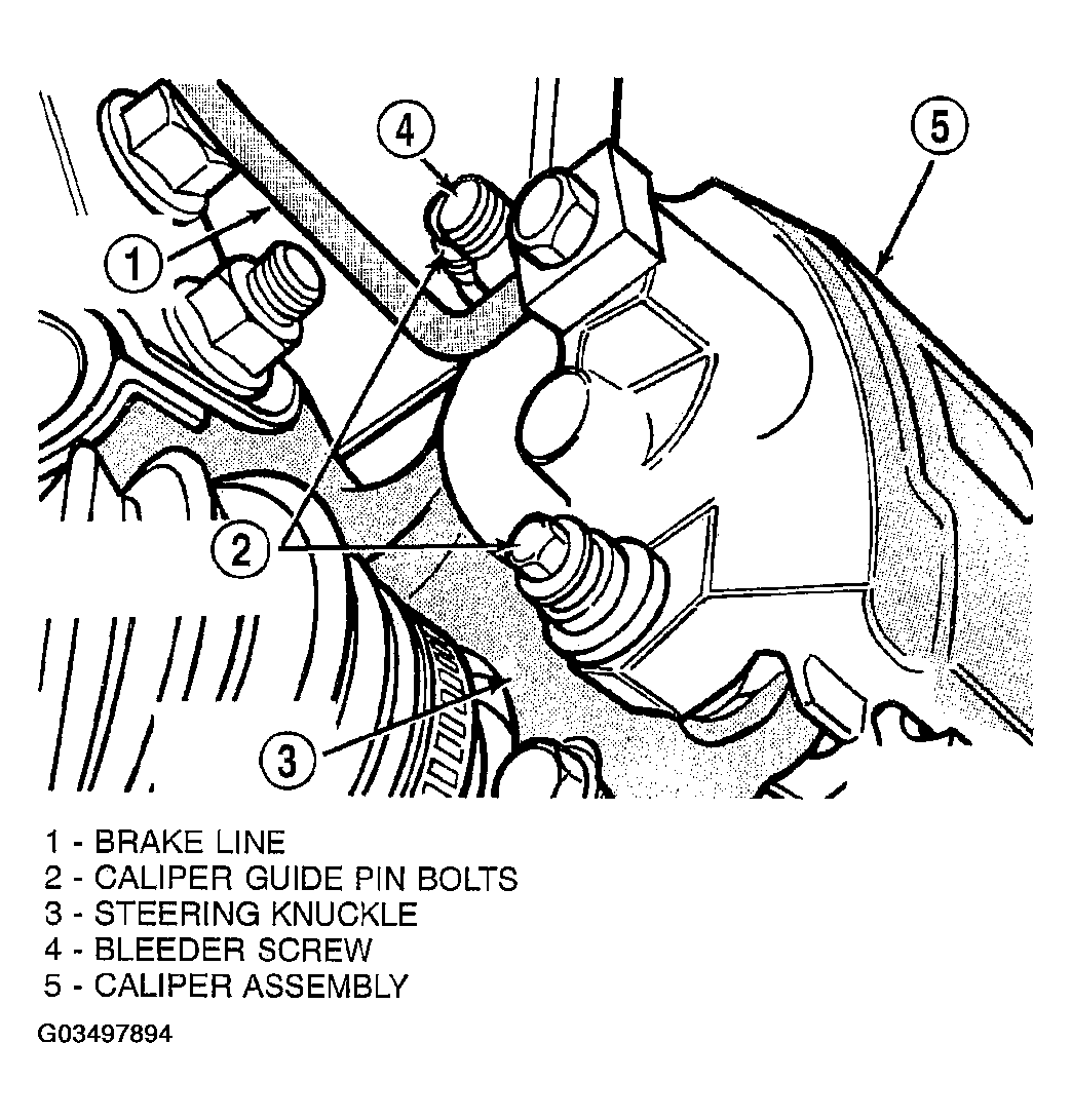 - Install braking disc back on front hub and bearing assembly. Install front brake caliper assembly on steering knuckle. Install the 2 caliper assembly to steering knuckle attaching bolts (Figure ). Tighten the caliper assembly guide pin bolts to a torque of 19 N.m (192 in.lbs.).