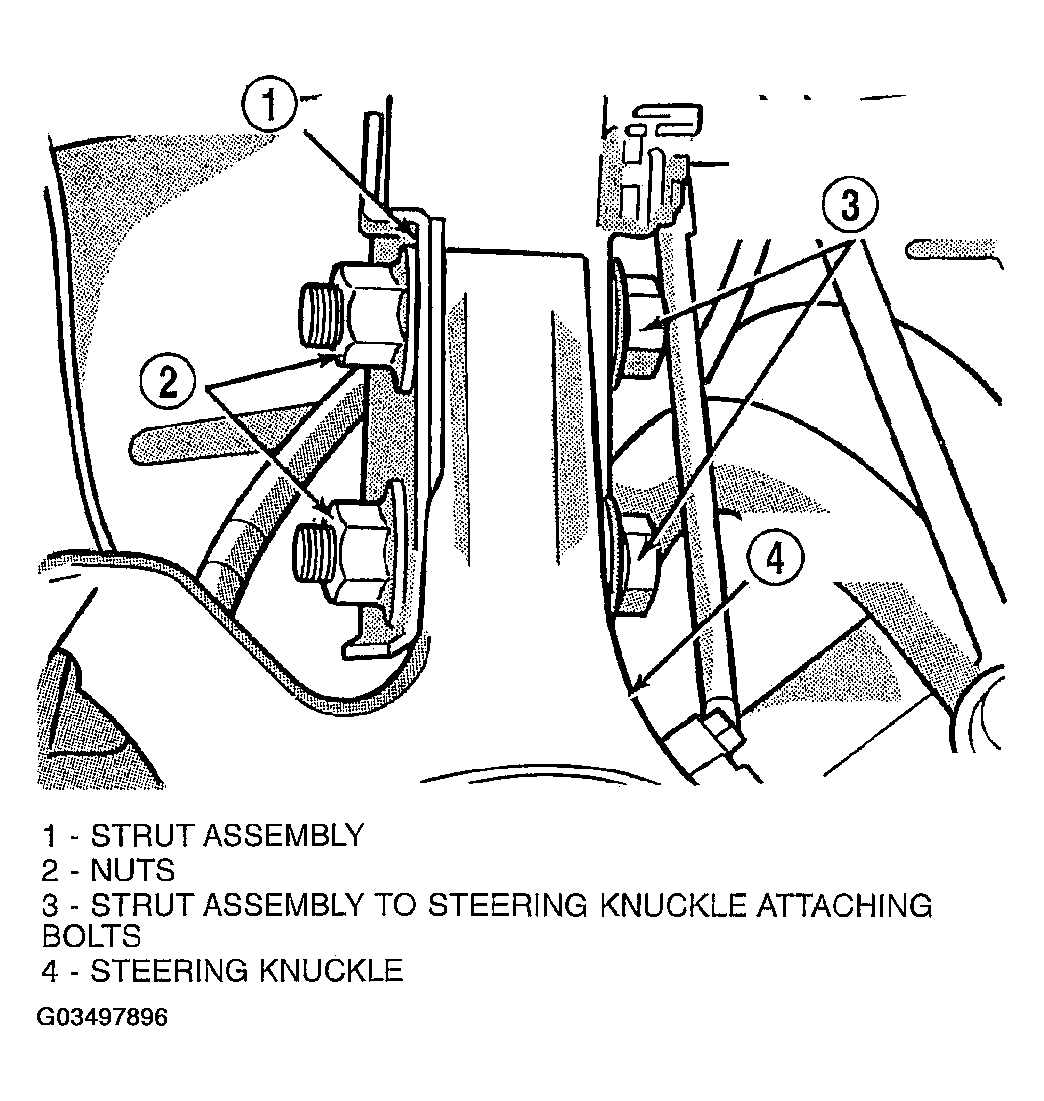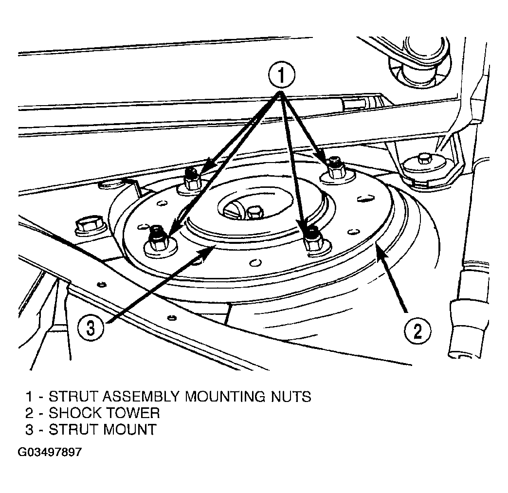 - Install front strut assembly into shock tower. Install the 4 strut assembly upper mount to shock tower attaching nuts (Figure ). Tighten the 4 strut mount to strut tower attaching nuts to a torque of 37 N.m (28 ft. lbs.) torque.
