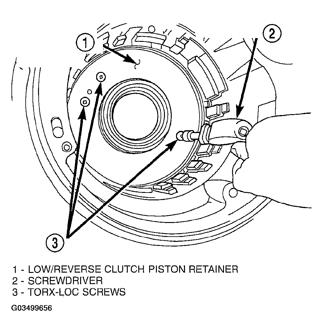 - Install low/reverse piston retainer-to-case screws (Fig 4 ) and torque to 5 N.m (45 in.lbs.).