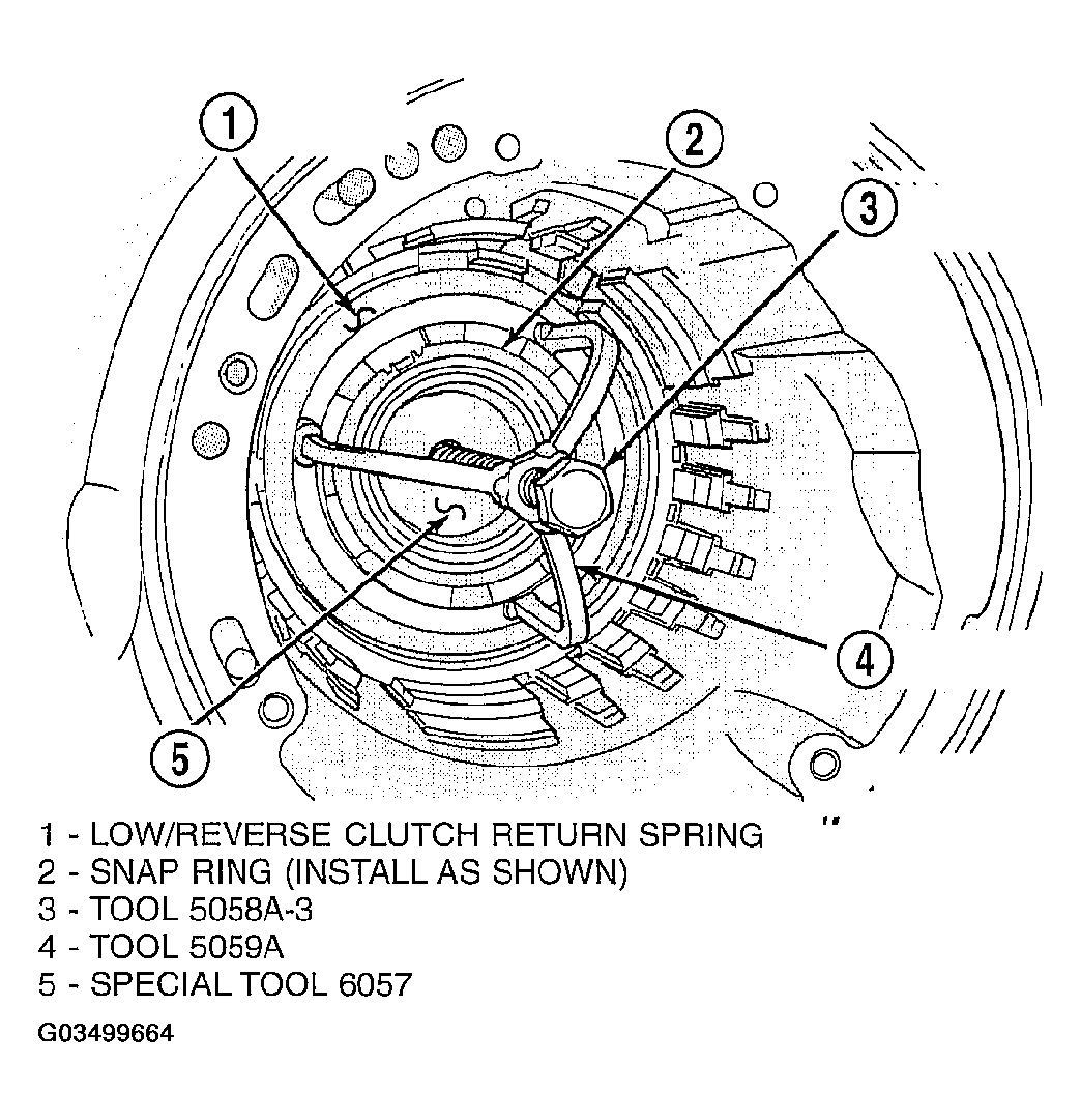 - Install and load low/reverse spring compressor tool as shown in (Fig 11 ) (Fig 12 ) to facilitate snap ring installation.