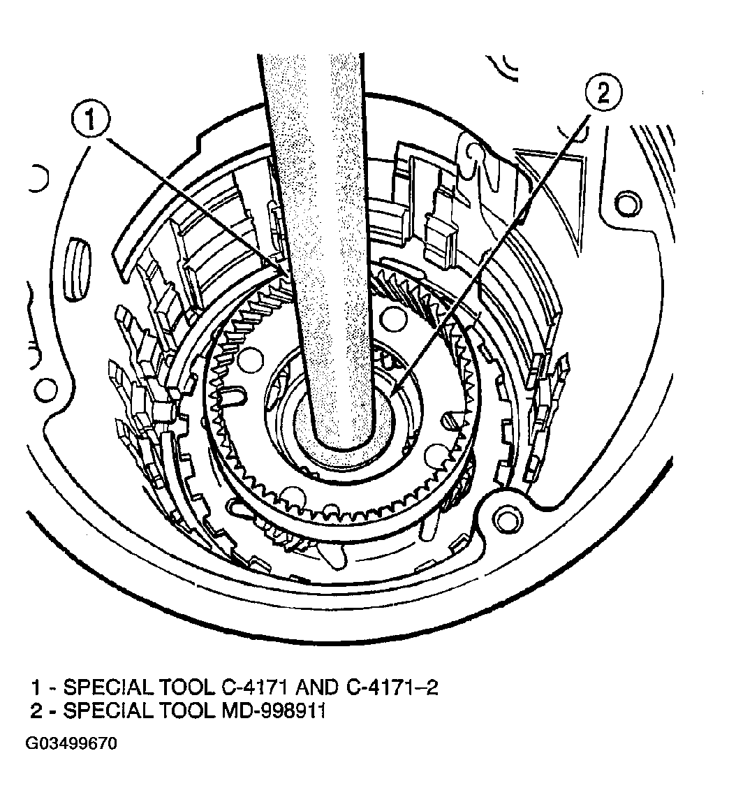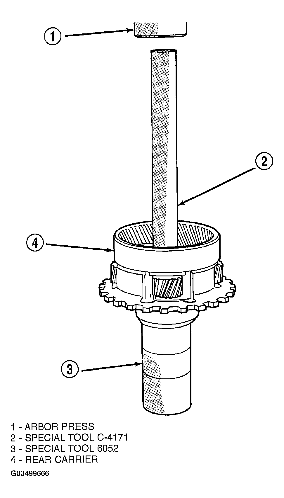 - Install output shaft/rear carrier into rear bearing. The shaft must be pressed into position. Use special tool MD-998911 (Disc) and C- 4171 and C4171-2 (Handle) to press shaft into rear bearing (Fig 18 ).
