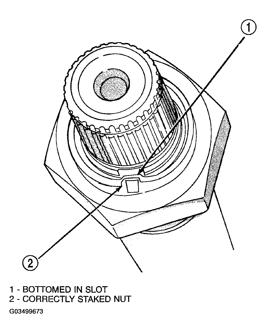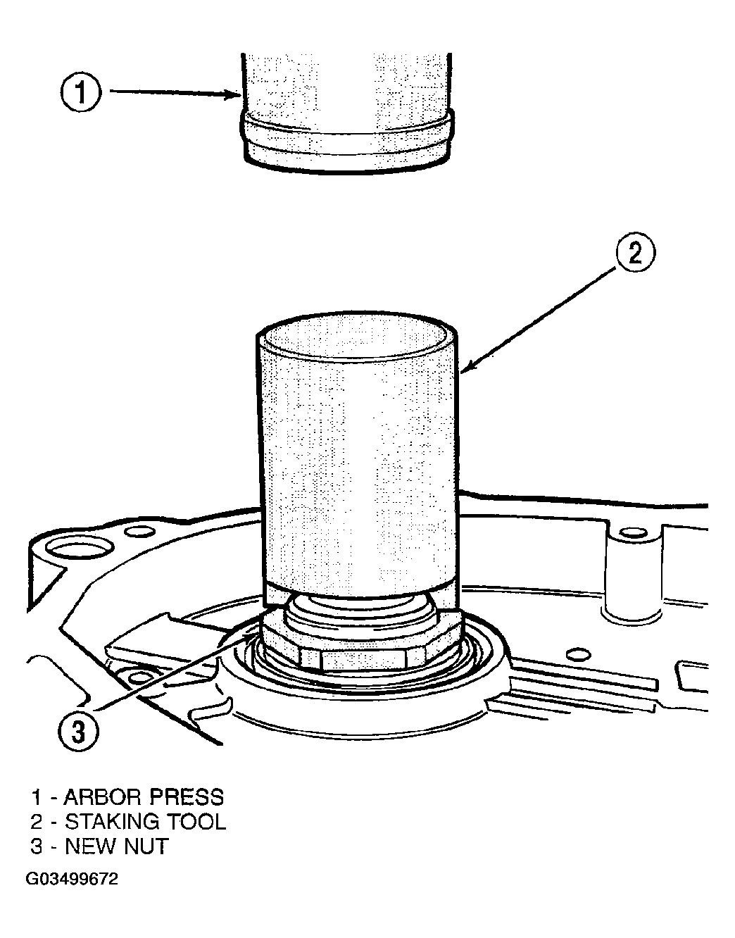 ). Use special tool 6639 to stake output shaft nut and special tool 6589 to stake transfer shaft.CAUTION: Failure to stake shaft nuts could allow the nuts to back-off during use.