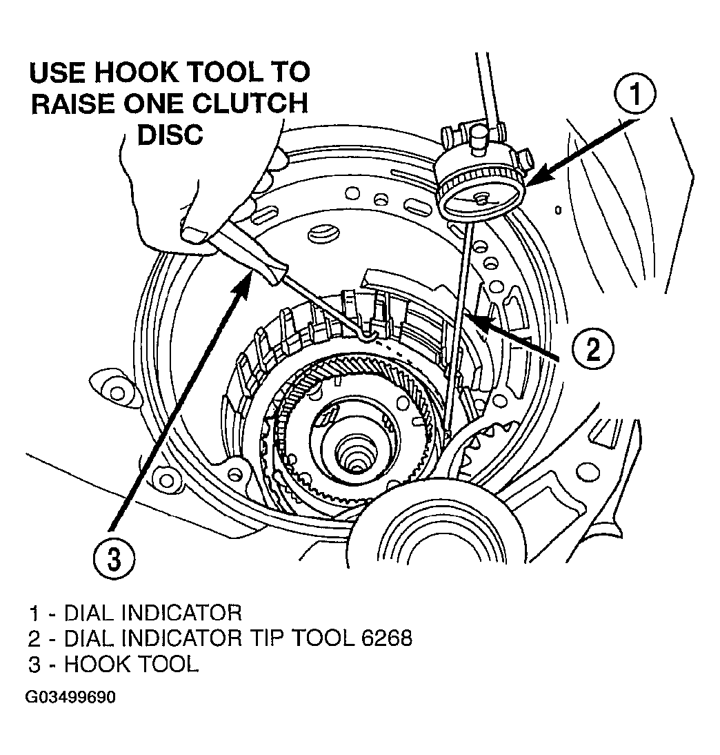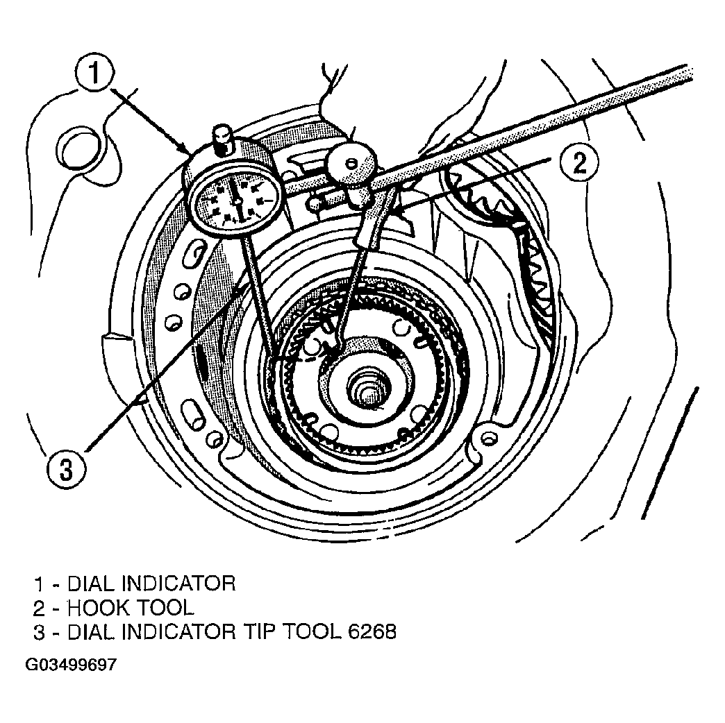 - As a final check of the transaxle, measure the input shaft end play. This will indicate when a #4 thrust plate change is required. The number 4 thrust plate is located behind the overdrive clutch hub. Attach a dial indicator to transaxle bell housing with its plunger seated against end of input shaft (Figure ). Move input shaft in and out to obtain end play reading. End play specifications are 0.13 to 0.64 mm (0.005 to 0.025 inch). If not within specifications, make the necessary thrust plate adjustment.