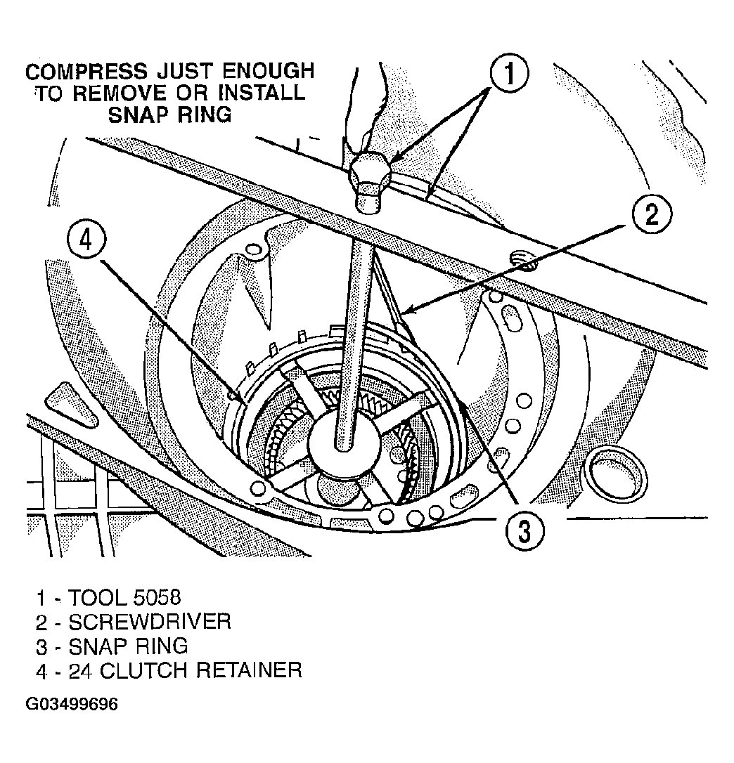 - Set up Tool 5058 as shown in (Fig 44 ). Compress 2/4 clutch just enough to facilitate snap ring installation.