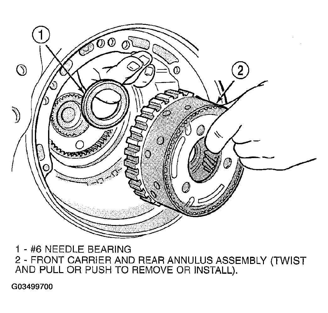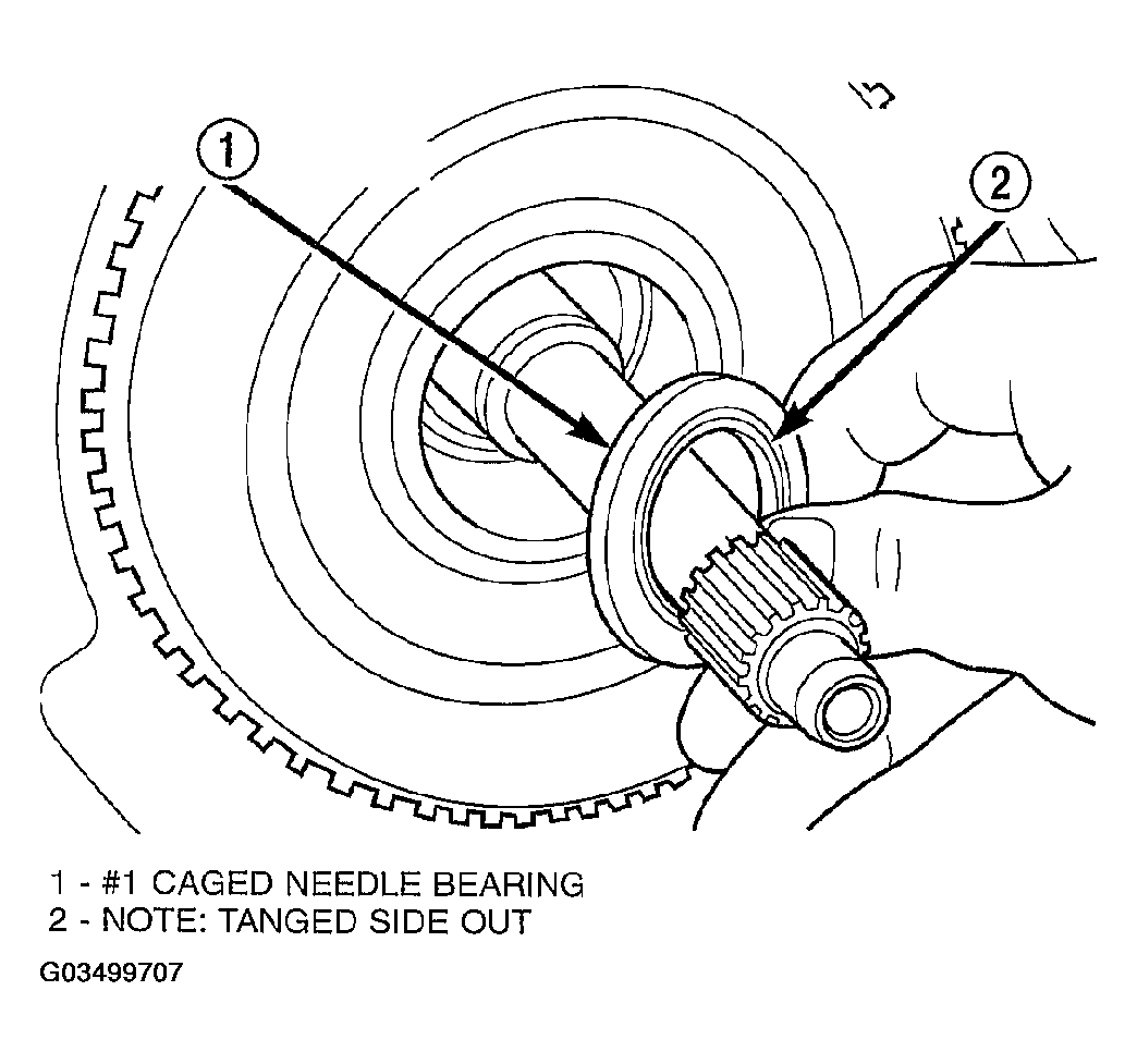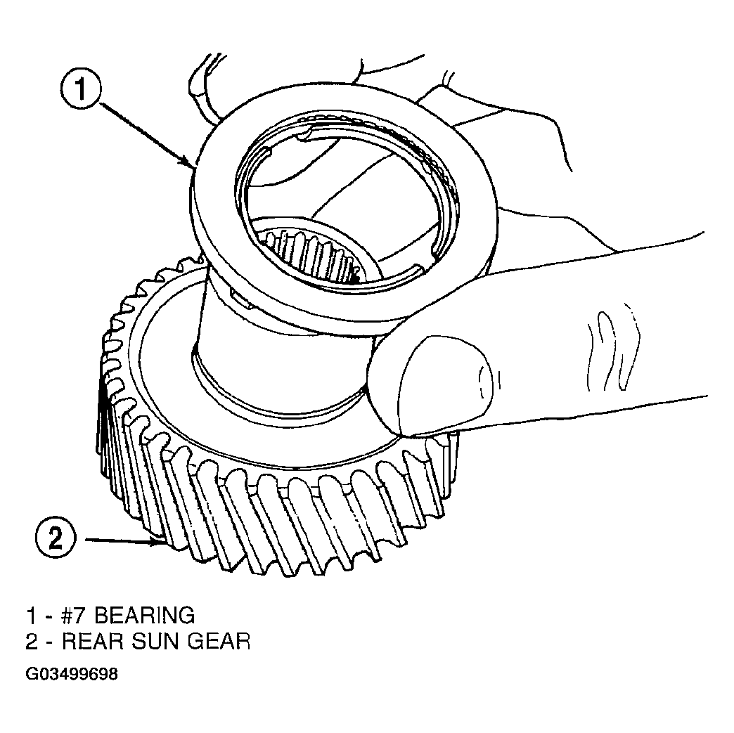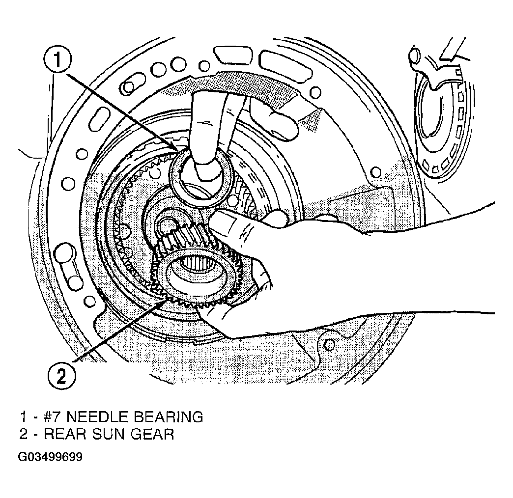 - Install the #7 needle bearing to the rear sun gear (Fig 46 ). The number 7 needle bearing has three antireversal tabs and is common with the number 5 and number 2 position. The orientation should allow the bearing to seat flat against the rear sun gear. A small amount of petrolatum can be used to hold the bearing to the rear sun gear.