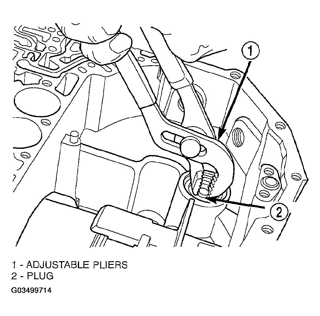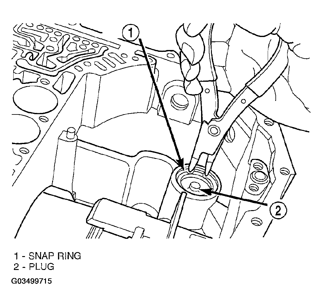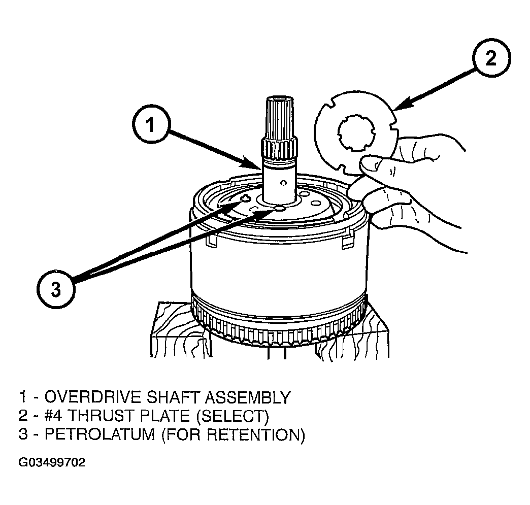 PART NUMBER THICKNESS 3836237AB 1.73mm (0.068 in.) 4431666AB 1.80mm (0.071 in.) 3836238AB 1.96mm (0.077 in.) 4431667AB 2.03mm (0.080 in.) 3836239AB 2.16mm (0.085 in.) 4431668AB 2.24mm (0.088 in.) 3836240AB 2.39mm (0.094 in.) 4431669AB 2.46mm (0.097 in.) 3836241AB 2:62mm (0.103 in.) 4446670AB 2.67mm (0.105 in.) 4446671AB 2.90mm (0.114 in.) - Remove oil pump, gasket, and input clutch assembly to gain access to and install proper #4 thrust plate.