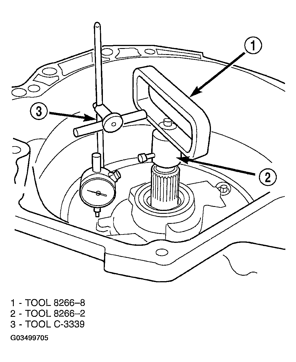 - Measure input shaft end play. Input shaft end play must be .005 to .025 inch. For example, if end play reading is 0.055 inch, select No. 4 Thrust Plate which is 0.071 to 0.074 thick. This should provide an input shaft end play reading of 0.020 inch, which is within specifications.