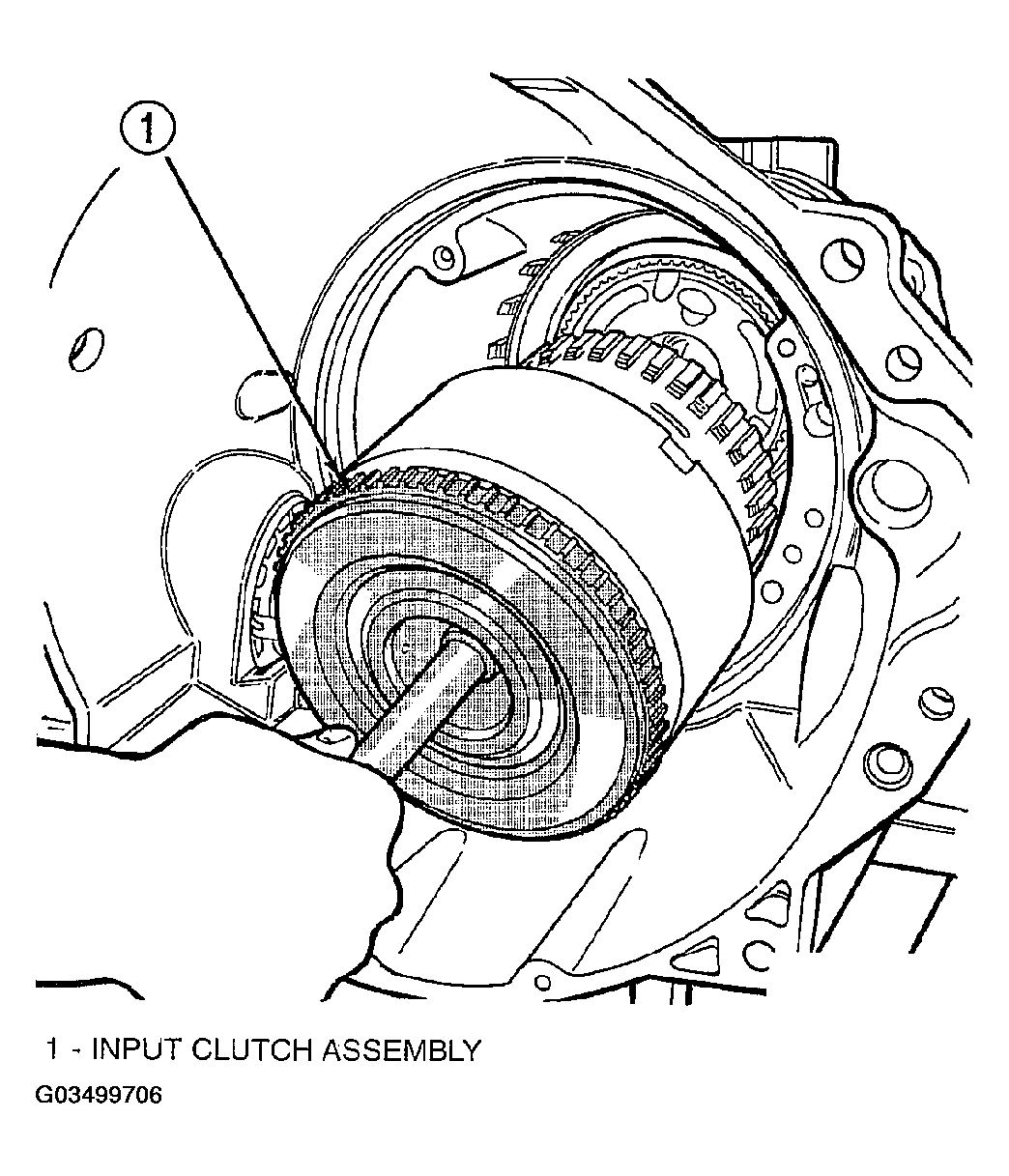 CAUTION: If view through input speed sensor hole is not as shown in (Fig 51 ), the input clutches assembly is not seated properly. - Install input clutch assembly with proper thrust plate (Fig 54 ).