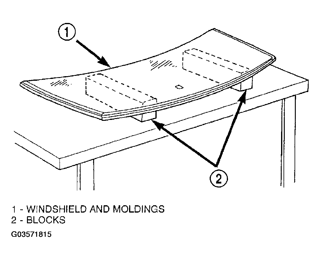 - Position the rear window inside up on a suitable work surface with two padded, wood 10 cm by 10 cm by 50 cm (4 in. by 4 in. by 20 in.) blocks, placed parallel 75 cm (2.5 ft.) apart (Fig 1