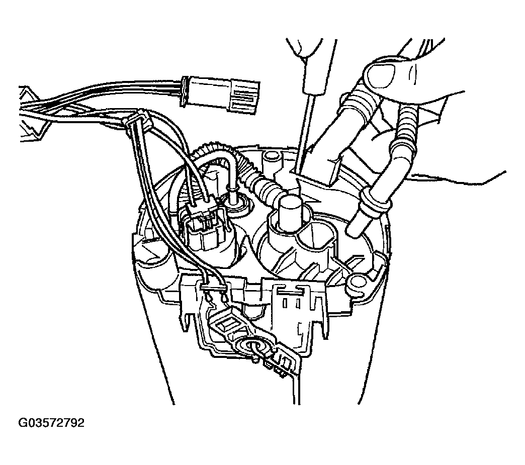 - Remove the fuel line from the top of the pump module. Use a small screwdriver to pry tab back and tip hose to one side and then pry the tab on the other side back to release the hose.