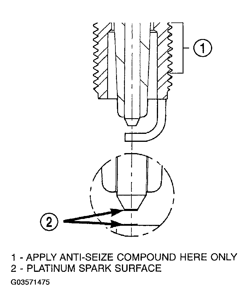 When the spark plugs use a single or double platinum tips and they have a recommended service life of 100,000 miles for normal driving conditions per schedule A in this manual. The spark plugs have a recommended service life of 75,000 miles for severe driving conditions per schedule B in this manual. A thin platinum pad is welded to both or just the center electrode end(s) as shown in (Fig 1). Extreme care must be used to prevent spark plug cross threading, mis-gapping (Fig 2) and ceramic insulator damage during plug removal and installation.