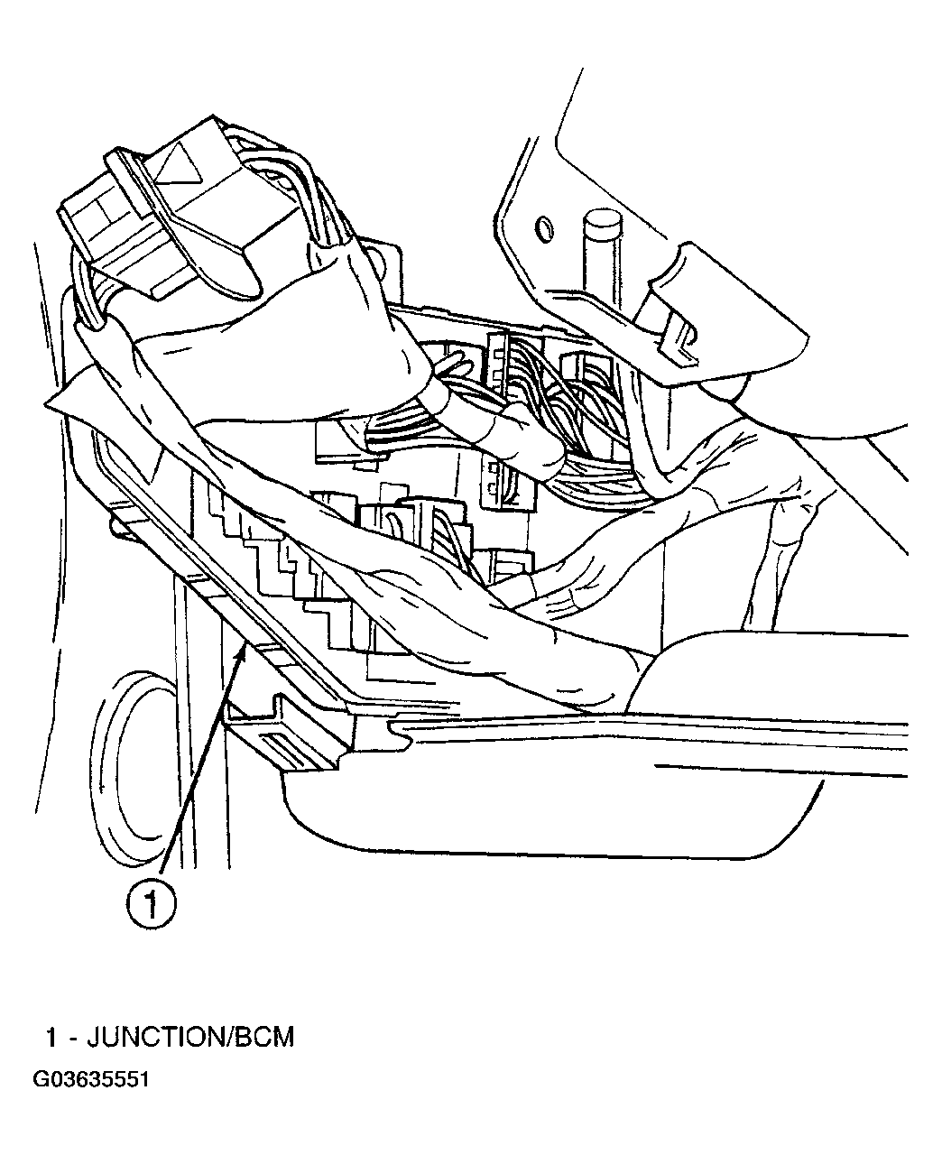 The Junction Block (JB) and Body Control Module (BCM) are attached to each other. After removal they can be separated. Junction Block and Body Control Module assemblies are located on the driver's side of the vehicle (Fig 1 ).