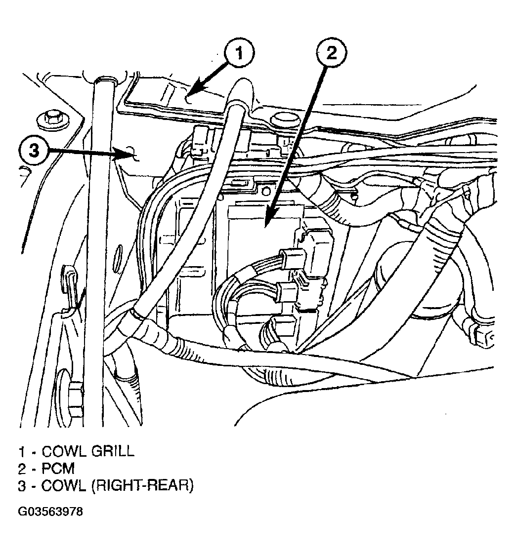 The Powertrain Control Module (PCM) is located in the right-rear section of the engine compartment under the cowl (Fig 1).
