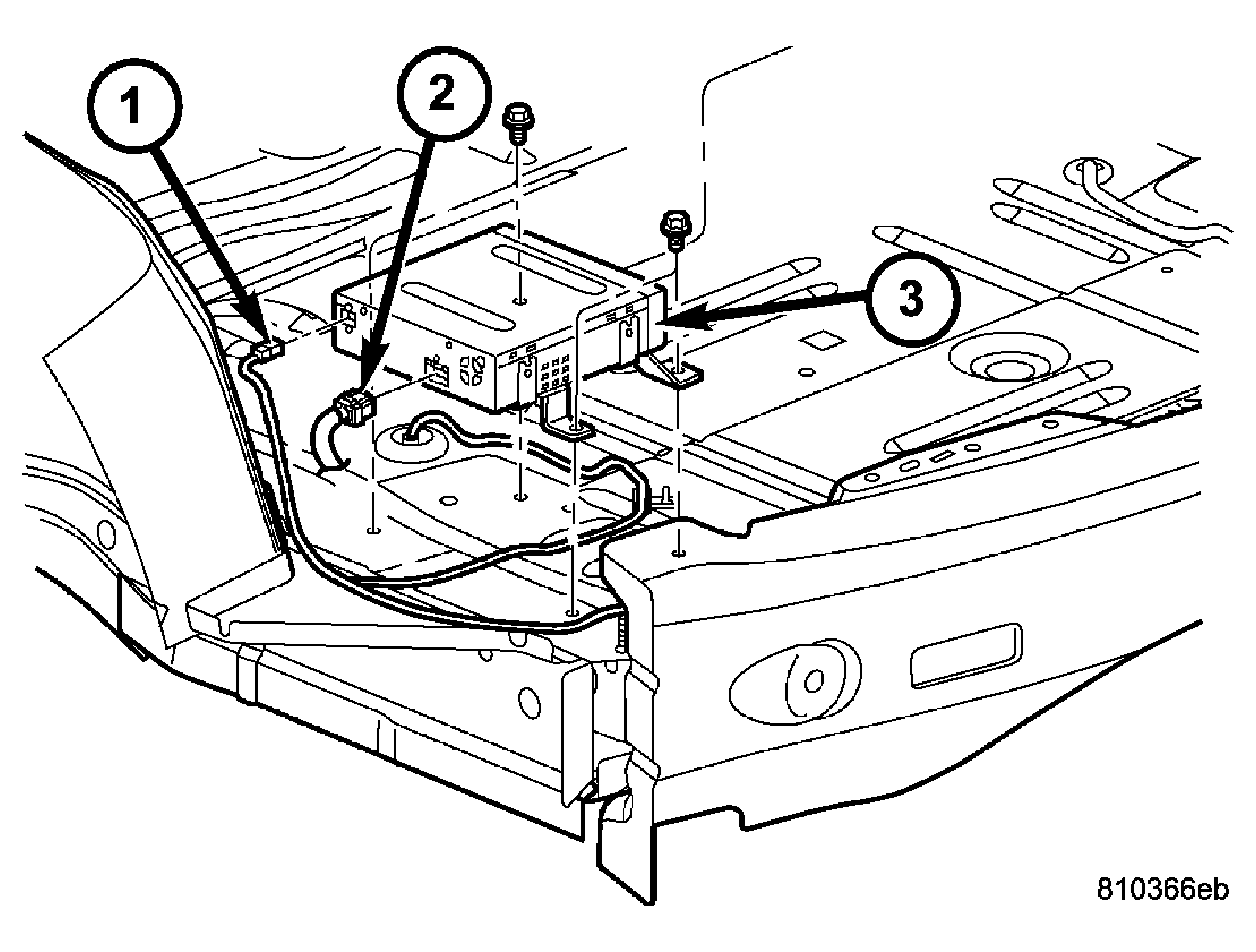 1 - ANTENNA CABLE - NAVIGATION 2 - ELECTRICAL HARNESS CONNECTOR 3 - NAVIGATION UNIT - Disconnect electrical harness connector and antenna cable from navigation unit.