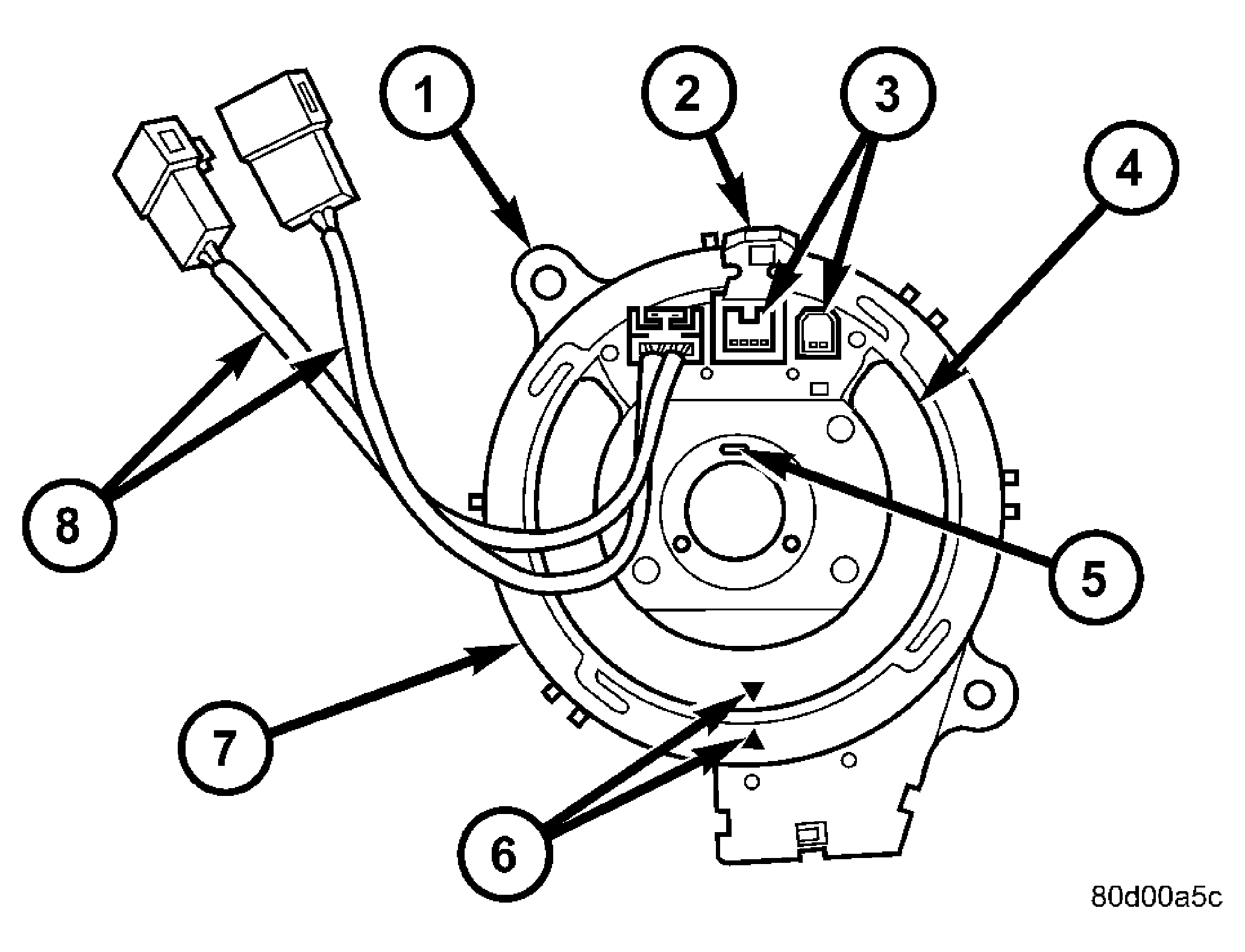 The lower surface of the rotor hub has three pins, two round and one oblong. These pins index the clockspring to the turn signal cancel cam unit in the multi-function switch mounting housing. Within the plastic case and wound around the rotor spool is a long ribbon-like tape that consists of several thin copper wire leads sandwiched between two thin plastic membranes. The outer end of the tape terminates at the connector receptacles that face the instrument panel, while the inner end of the tape terminates at the pigtail wires and connector receptacles on the hub of the clockspring rotor that face the steering wheel.