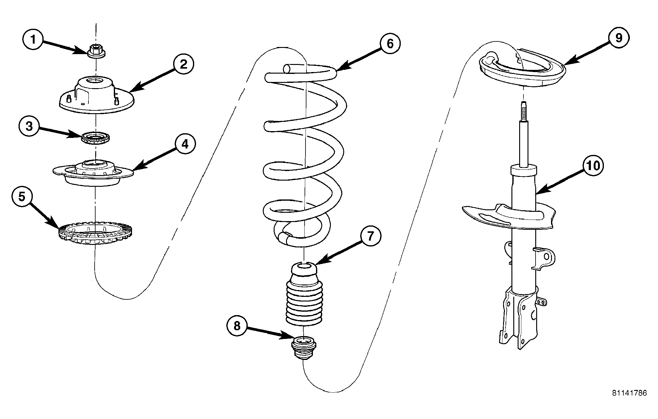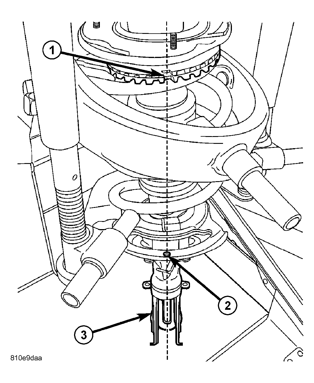 1 - NOTCHES IN UPPER SEAT AND ISOLATOR 2 - HOLE IN STRUT LOWER SEAT 3 - STRUT CLEVIS BRACKET - Slowly release tension from coil spring by backing off compressor drive fully. As tension is relieved, make sure upper mount, pivot bearing and upper seat are align properly.