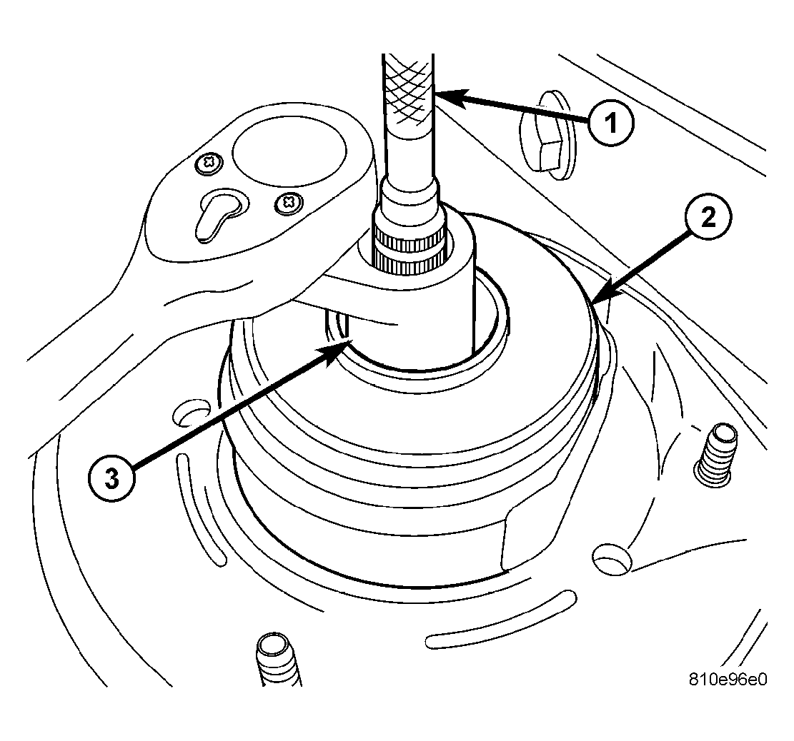 - Install Strut Nut Wrench (on end of a torque wrench), Special Tool 6864, on strut shaft retaining nut. See Figure. Next, install a 10 mm socket onto hex on end of strut shaft. While holding strut shaft from turning, tighten strut shaft retaining nut to a torque of 115 N.m (85 ft. lbs.).NOTE: Before releasing tension compressor has on spring, using following figure as reference, rotate upper spring seat and upper isolator (notches in each) to line up with hole in strut and clevis bracket (within 5° of one another). See Fig 1.