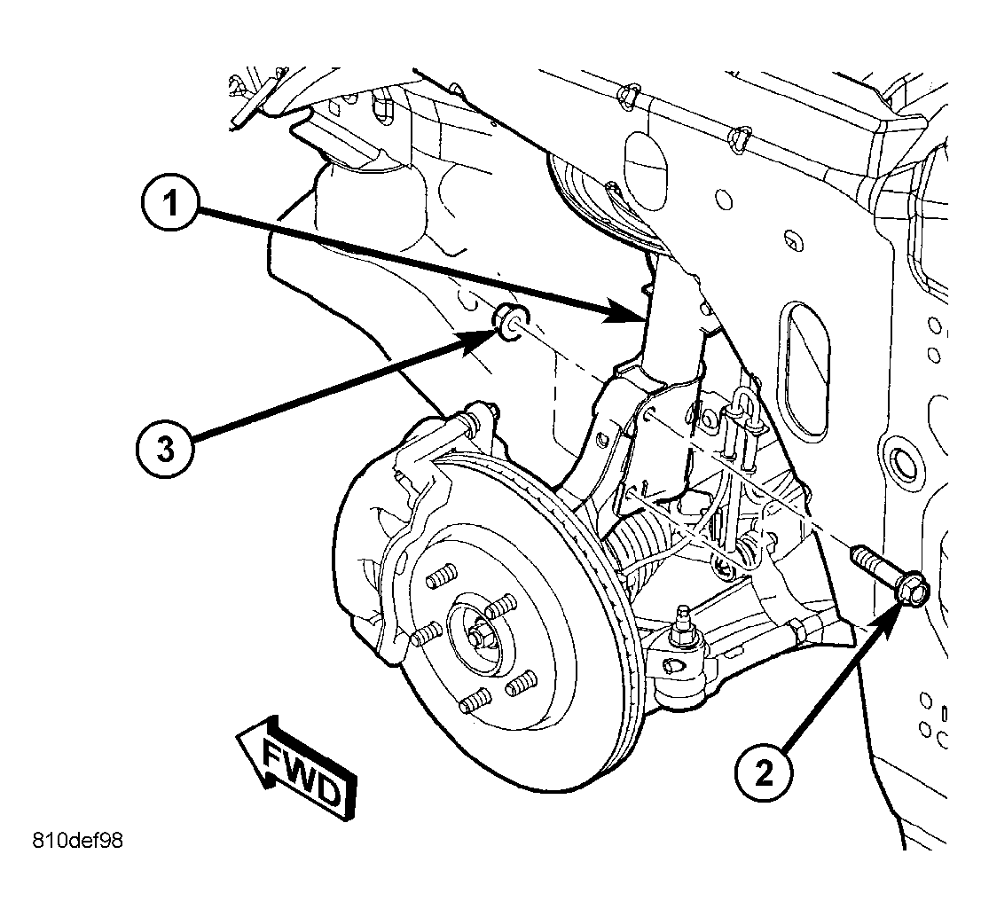 - If servicing left strut assembly, place coolant recovery bottle in its normal mounted position and install nuts fastening it in place. (Refer to COOLING/ENGINE/COOLANT RECOVERY PRESS CONTAINER - INSTALLATION)CAUTION: Steering knuckle to strut assembly attaching bolts are serrated and must not be turned during installation. Install nuts while holding bolts stationary in steering knuckle.CAUTION: If strut being serviced is equipped with a slotted lower clevis bracket mounting hole and eccentric cam strut attaching bolt, eccentric cam bolt must be installed in lower (slotted) hole in strut clevis bracket. See Fig 1.