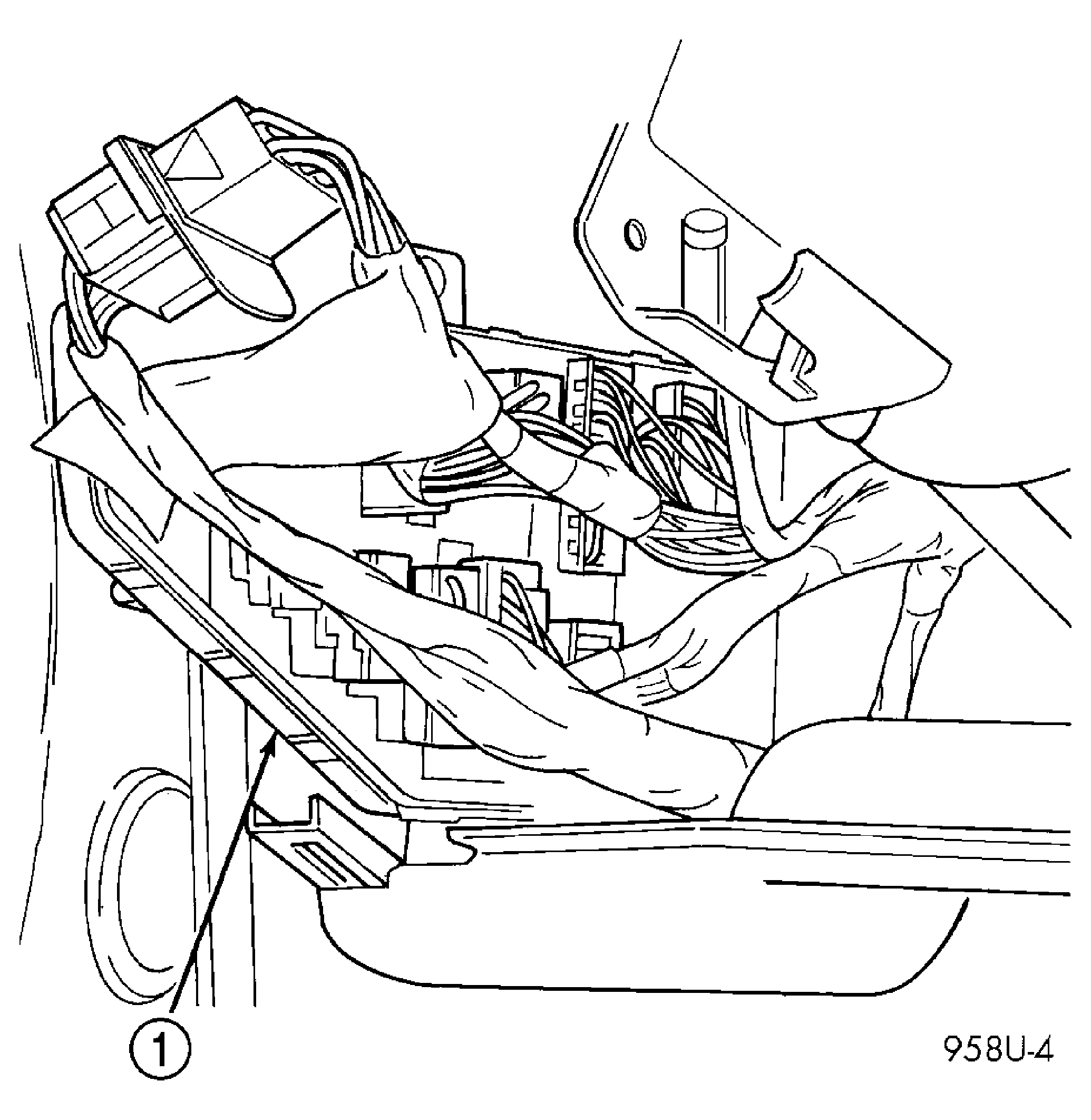 The Junction Block (JB) and Body Control Module (BCM) are attached to each other. After removal they can be separated. Junction Block and Body Control Module assemblies are located on the driver's side of the vehicle. See Fig 1.
