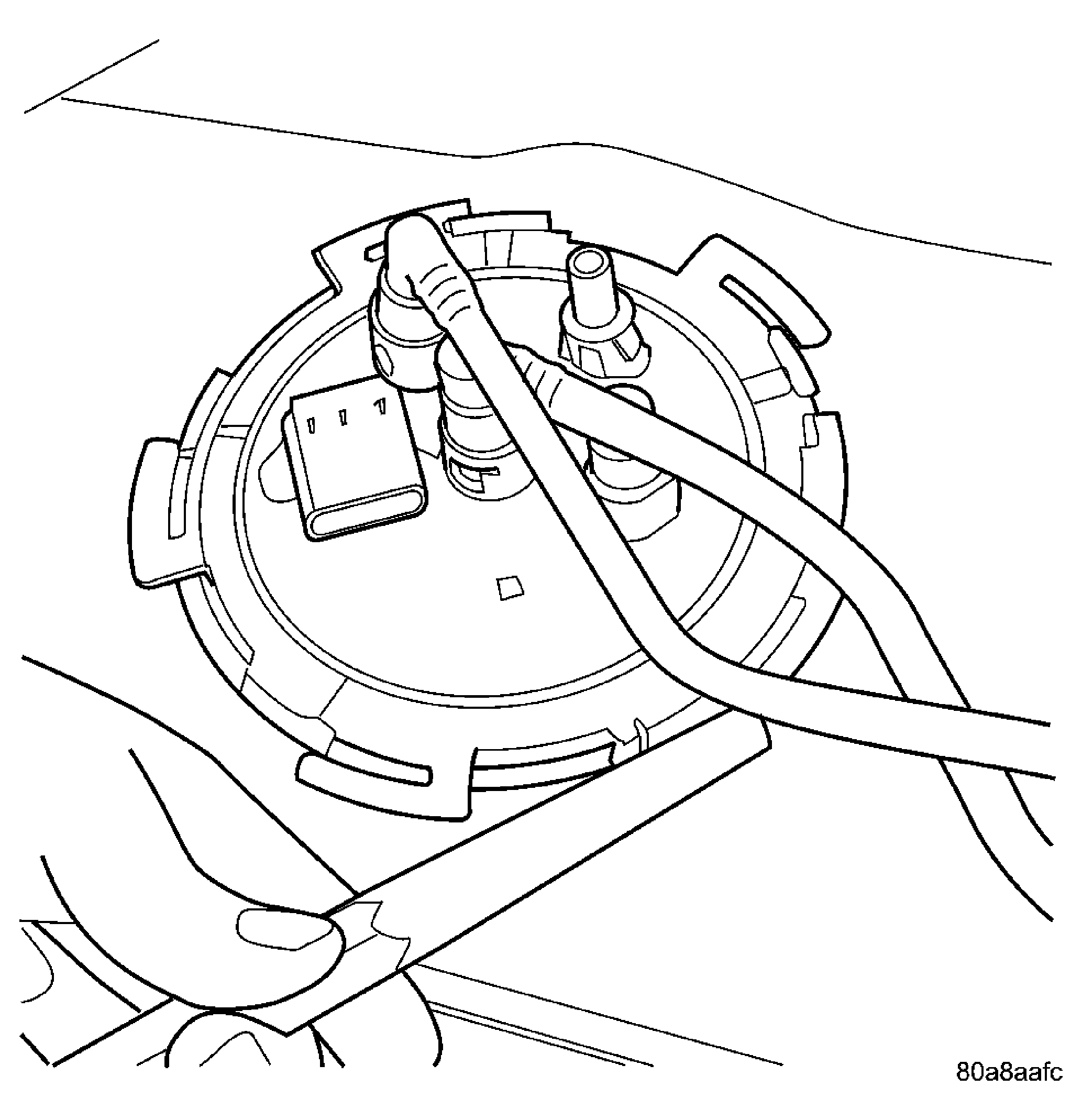 - Disconnect the electrical connection from the fuel pump module, by pushing down on connector retainer and pulling connector off of module.