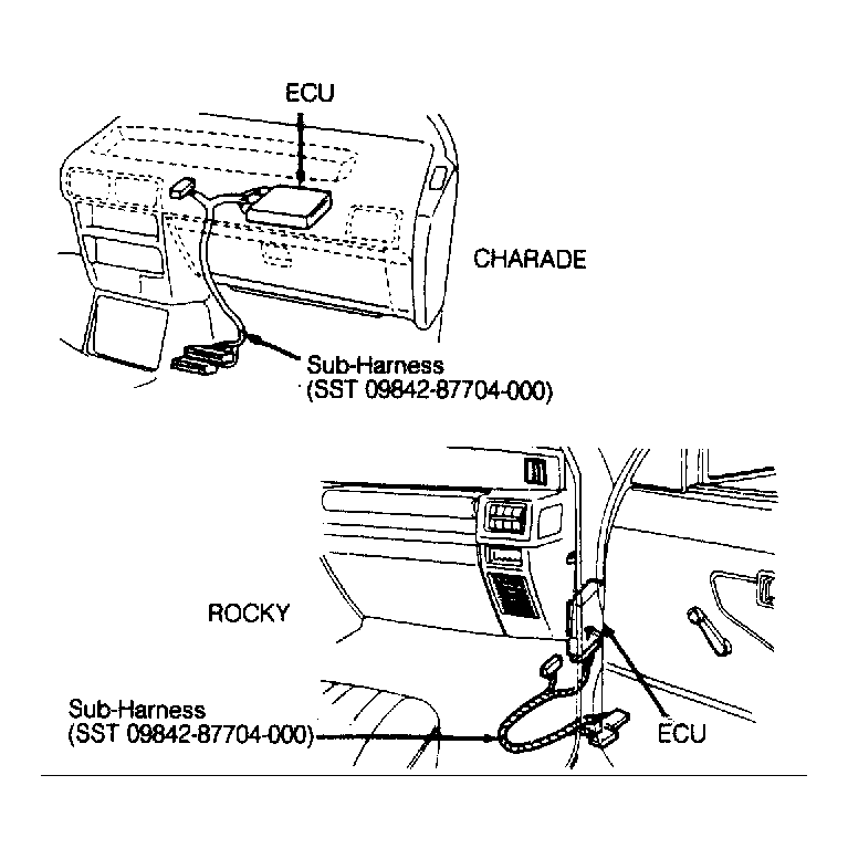 - On all models, connect Sub-Harness (SST 09842-87704-000) between ECU and engine wiring. See Figure . Reconnect negative battery cable. Warm engine to normal operating temperature. Install jumper wire between sub-harness terminals No. 32 and 29 on 1.0L Charade or between sub-harness terminals No. 12 and 39 on all others. See Figure .