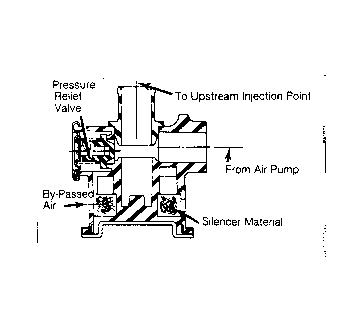 Relief valve is to control maximum air pump pressure at high engine speeds. When discharge pressure exceeds approximately 9 psi, relief valve opens to vent excess air pressure to atmosphere. See Fig 1 .