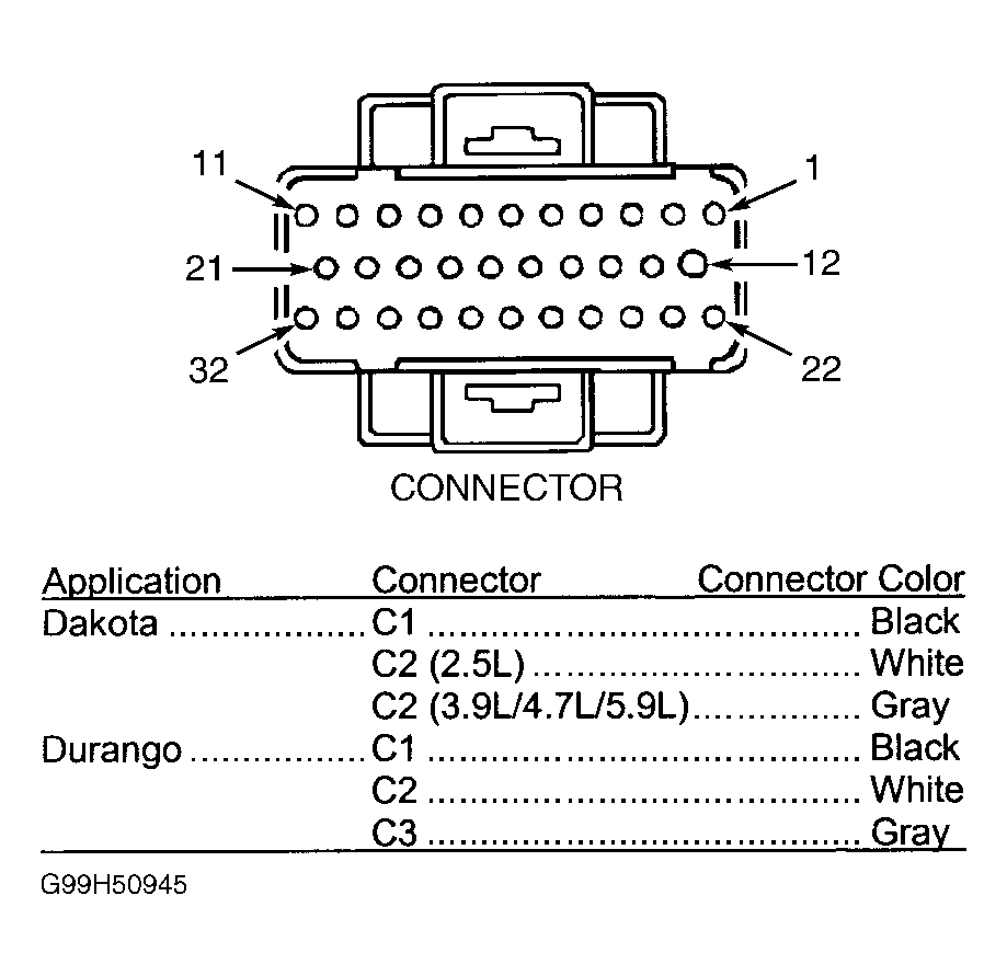 Fig 3: Identifying Central Timer Module (CTM) C2 Connector Terminals (Dakota Base-Line Model C1 Connector Is Similar)