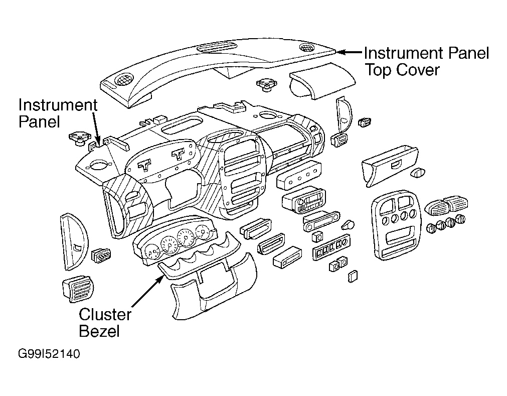 1. Disconnect negative battery cable. Using a trim stick, remove left and right "A" pillar trim panels. Lift up on bottom outer areas of cluster bezel and along the rearward edge of top cover to disengage mounting clips. Pull top cover rearward until forward pins disengage from instrument panel. Remove top cover. See Fig 1 .