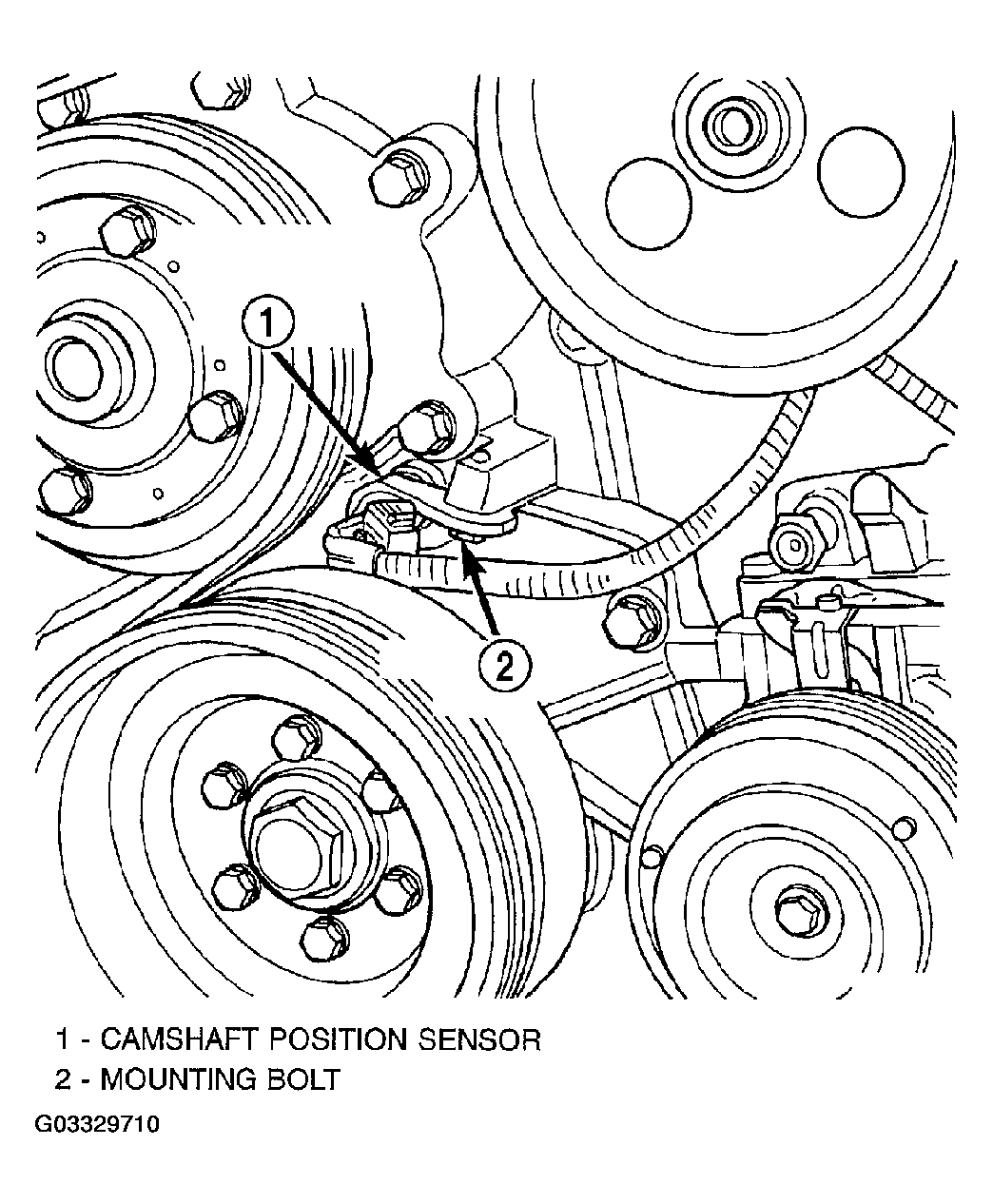 The camshaft position sensor is mounted in the front of the timing case cover (Fig 1 ). The bottom of the sensor is positioned in front of the camshaft sprocket.