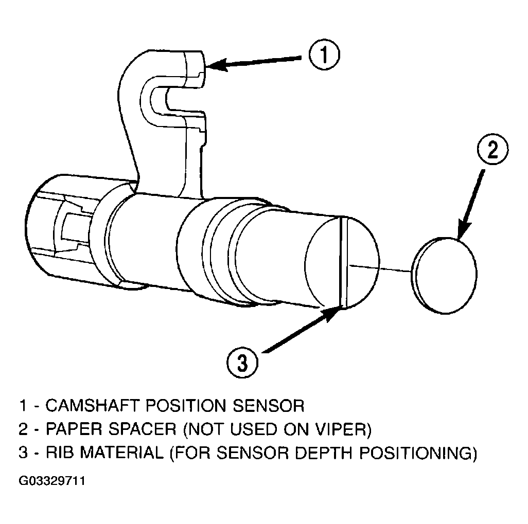 The camshaft position sensor detects when a step in the camshaft sprocket passes beneath it (Fig 2 ). When the sensor detects the step, the input voltage from the sensor to the PCM switches from low (0.3 volts) to high (5 volts). As the step returns away from the sensor, the input voltage switches back to low (0.3 volts). The paper spacer is not used on Viper. Don't use at all it plugs up the oil pickup screen.