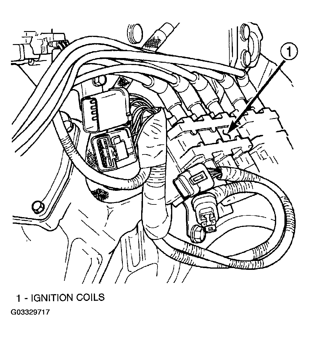 The electronic ignition system uses two epoxy filled coil packs mounted on a bracket at the rear of the engine (Fig 1 ) and (Fig 2 ). The coil pack on the left side, contains three separate coils and fires cylinders 1, 2, 3, 4, 6, and 7. The coil pack on the right side, contains two individual coils and fires cylinders 5, 8, 9, and 10. When one of the coils discharges, it fires two cylinders at the same time (one cylinder on its compression stroke, the other on its exhaust stroke).
