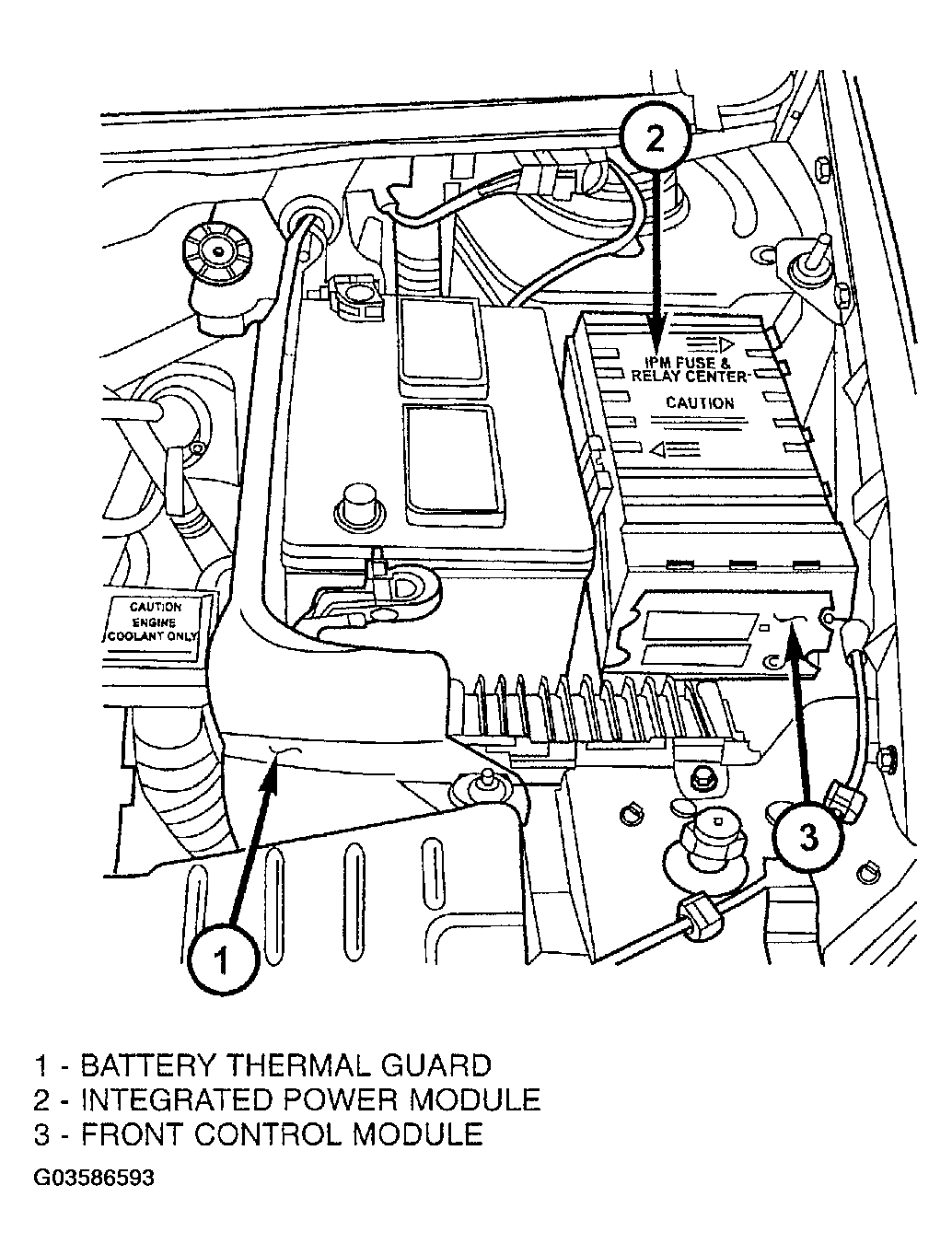 The Integrated Power Module (IPM) is a combination of the Power Distribution Center (PDC) and the Front Control Module (FCM). The IPM is located in the engine compartment, next to the battery on this model (Fig 1 ). The power distribution center mates directly with the Front Control Module (FCM) to form the IPM Fuse and Relay Center. The power distribution center (PDC) is a printed circuit board based module that contains fuses and relays, while the front control module contains the electronics controlling the IPM and other functions. This IPM connects directly to the battery positive via a four pin connector. The ground connection is via two other connectors. The IPM provides the primary means of voltage distribution and protection for the entire vehicle.
