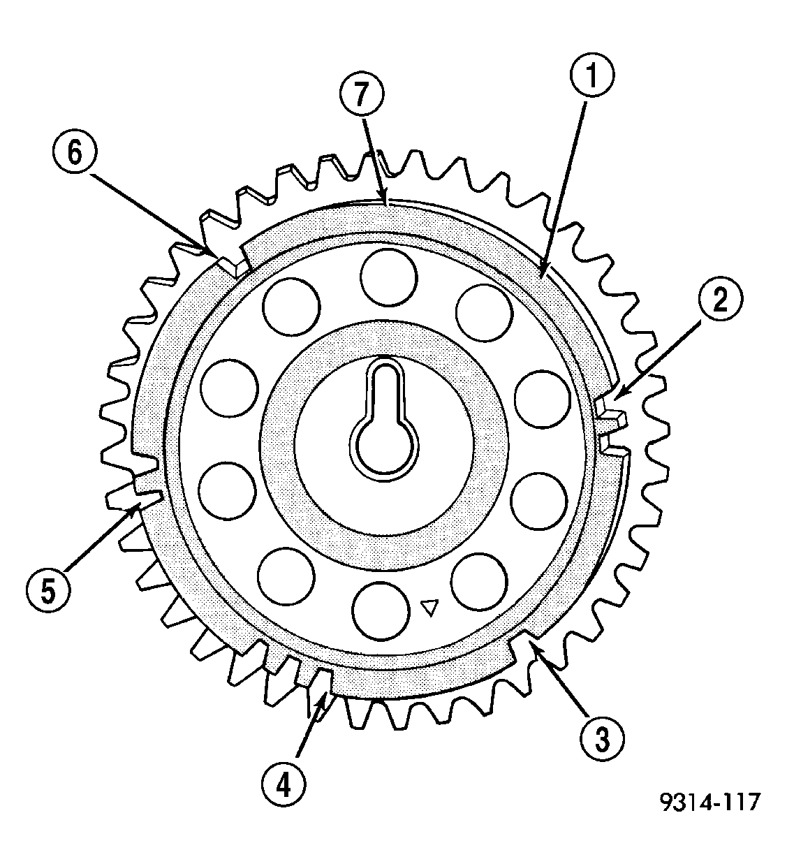 Top Dead Center (TDC) does not occur when notches on the camshaft sprocket pass below the sensor. TDC occurs after the camshaft pulse (or pulses) and after the 4 crankshaft pulses associated with the particular cylinder. The arrows and cylinder call outs on represent which cylinder the flat spot and notches identify, they do not indicate TDC position. See Fig 2.