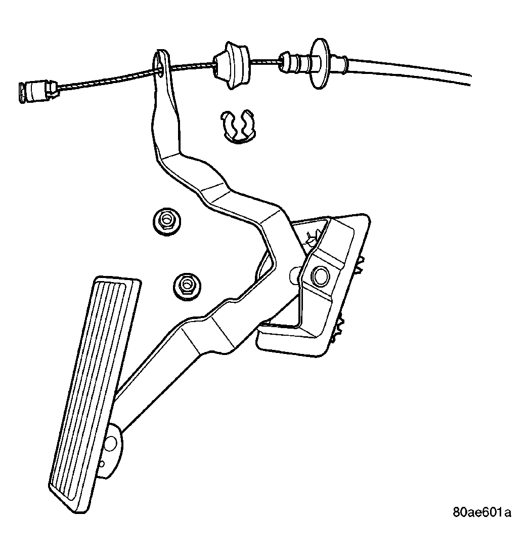 4. From inside the vehicle, hold the throttle pedal up and remove the cable retainer and cable from upper end of pedal shaft. See Figure.