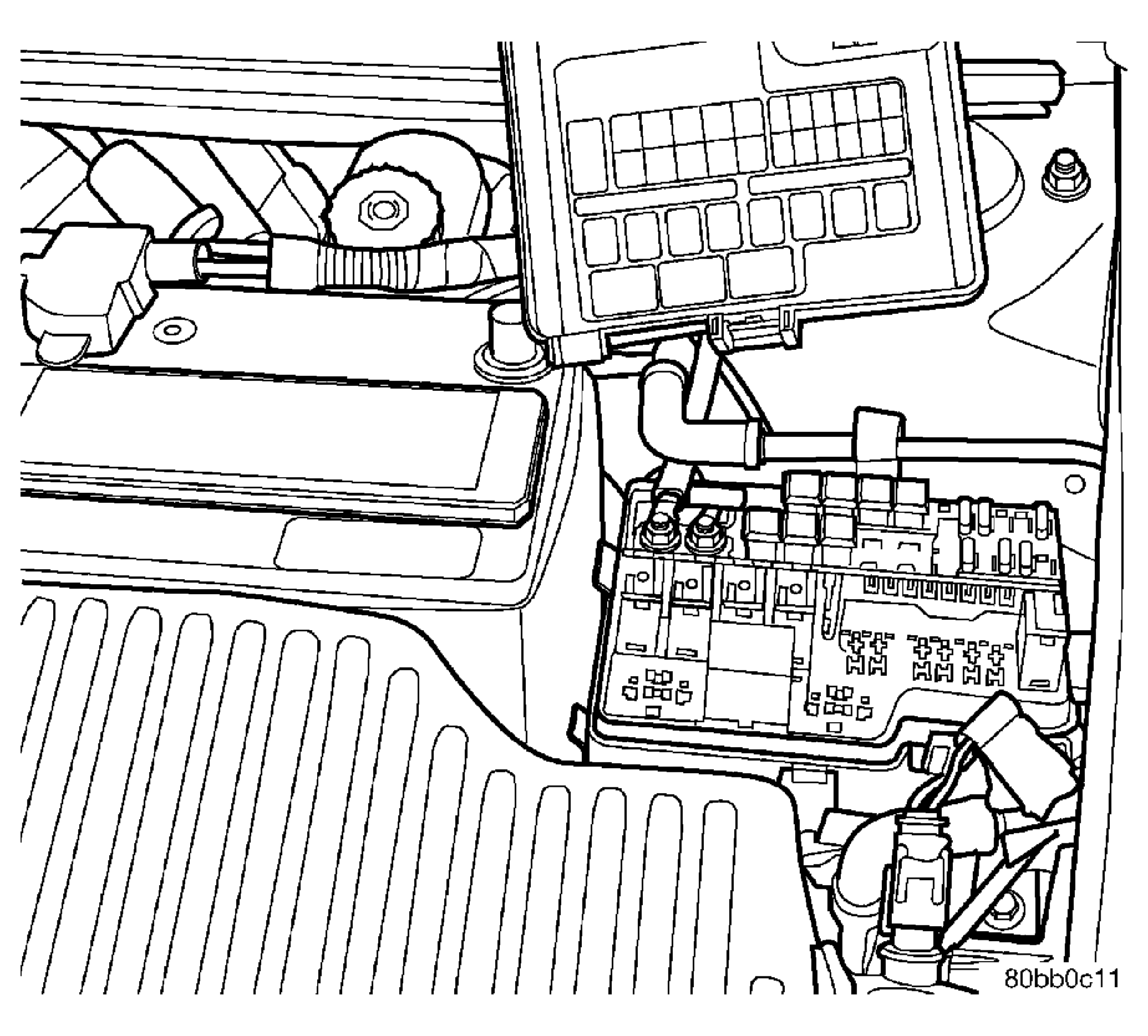 The relay is located in the Power Distribution Center (PDC). See Fig 1. The PDC is located next to the battery in the engine compartment. For the location of the relay within the PDC, refer to the PDC cover for location. Check electrical terminals for corrosion and repair as necessary.