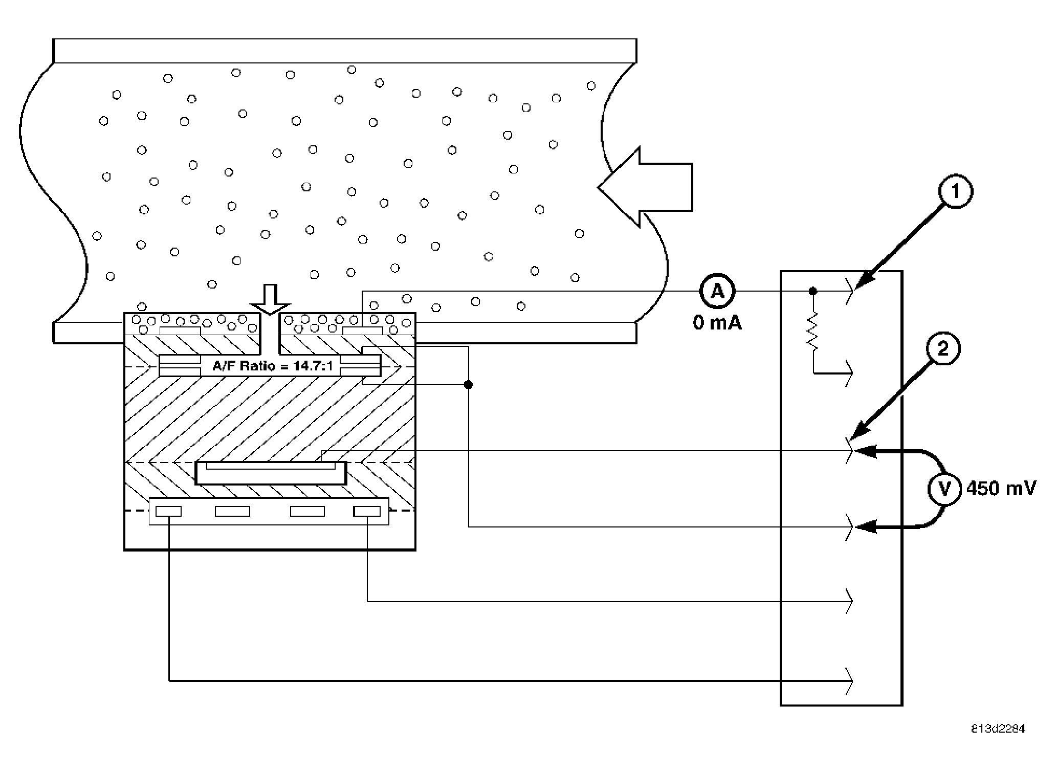 The sensor cell measures the difference between the oxygen concentration in the gas sample chamber and the oxygen concentration in the outside air from the reference air channel. A small voltage is generated across the sensor, which is proportional to the air-fuel ratio in the sample chamber. At stoichiometric ratio (14.7 lbs. of dry air to 1 part fuel), the corresponding open circuit voltage at the sensor cell is 450 mV. If the stoichiometric ratio in the sampler chamber is higher than 1 (excess air) a lower voltage is produced. If the stoichiometric ratio is lower than 1 (insufficient air) a higher voltage is produced. See Fig 2.