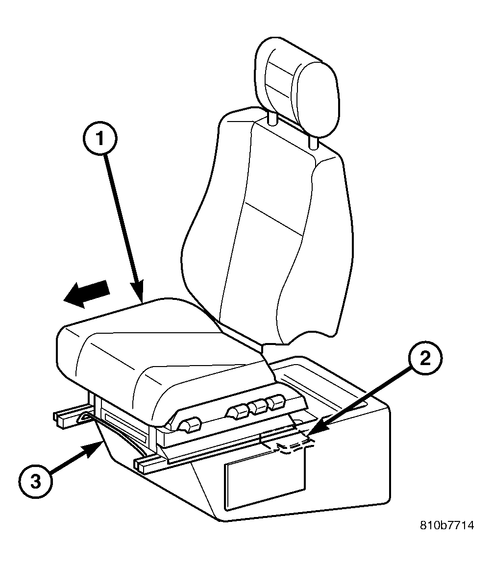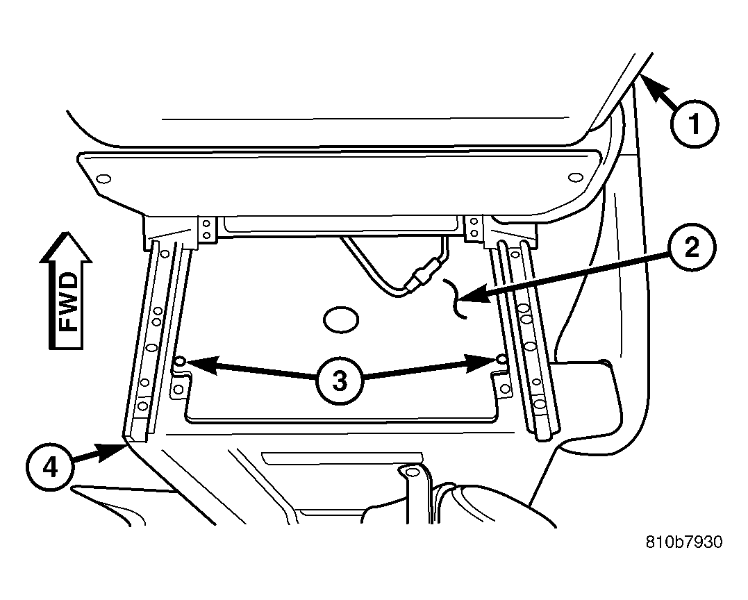 1 - DRIVER SEAT BACK 2 - COVER PANEL 3 - SCREW (2) 4 - SEAT RISER - Remove the cover panel from the top of the driver side seat riser.