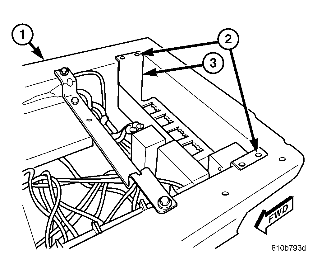 1 - SEAT RISER 2 - SCREW (2) 3 - CONTROL MODULE BRACKET - Remove the control module bracket from the top of the driver side seat riser.