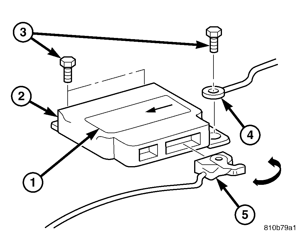 1 - ACM LABEL 2 - ACM 3 - SCREW (3) 4 - GROUND EYELET 5 - CONNECTOR - Lift the ACM upward far enough to access the ACM wiring connection. Depress the release and lift the lever arm to disconnect the vehicle wire harness connector for the ACM from the ACM connector receptacle located on the left facing side of the module.