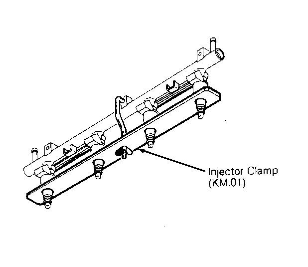 - Disconnect injector connectors. Remove fuel rail and injectors as an assembly. Use Injector Clamp (KM.01 ) to hold injectors in fuel rail during test. See Fig 1 .