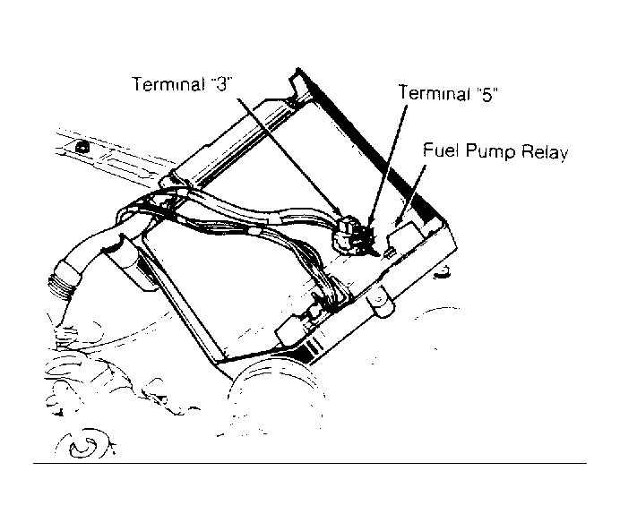- Start fuel pump by placing jumper wire between terminals 3 and 5 (large wires) on fuel pump relay connector. Minimum delivery should be 2 qts. (1.8 liters) in one minute. See Fig 1 .