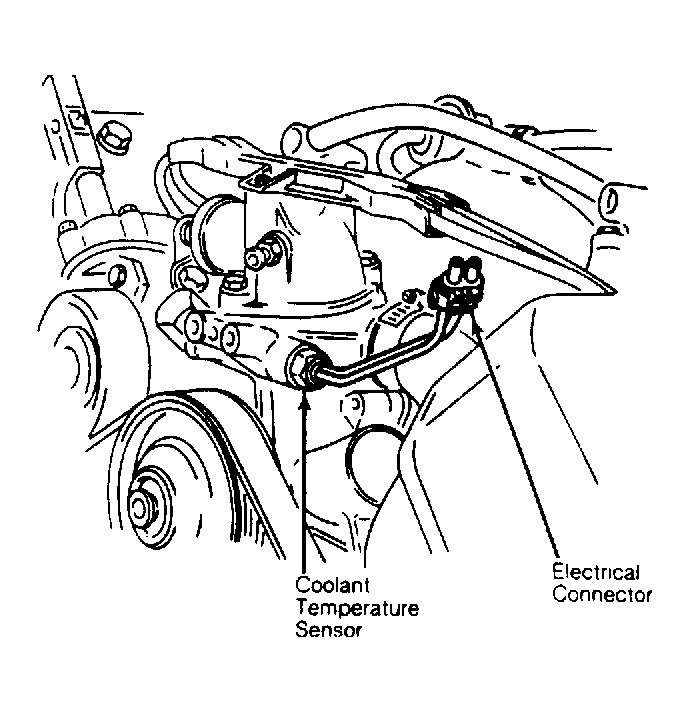 The coolant temperature sensor is located in the thermostat housing, above water pump. See