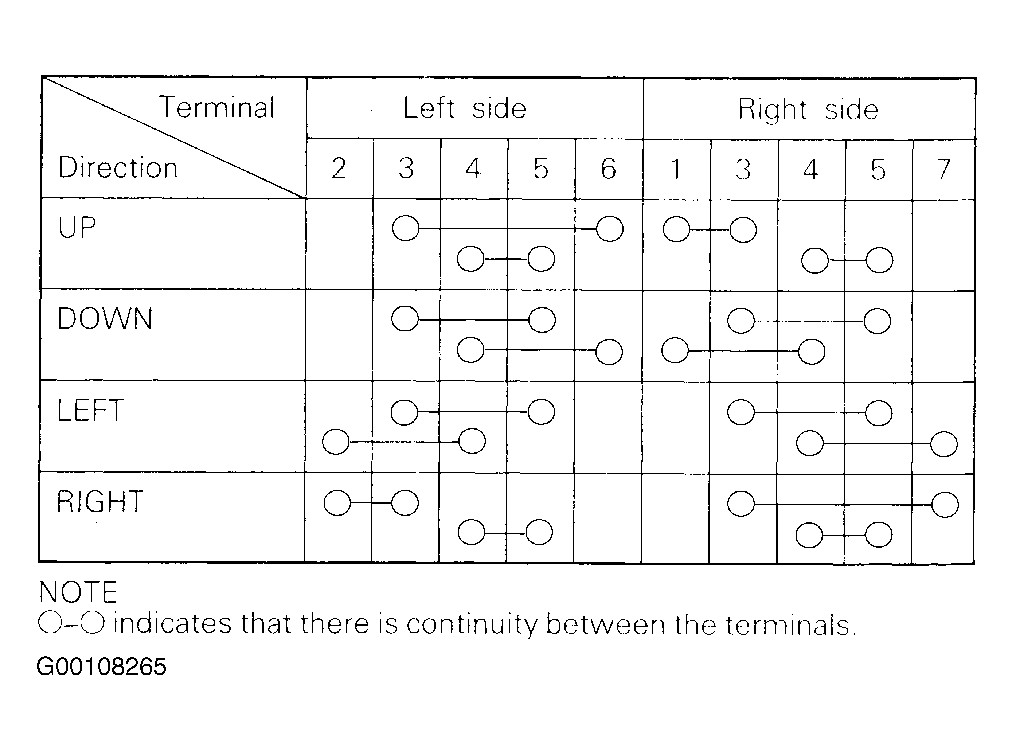 Using an ohmmeter, test for continuity between terminals as shown. See