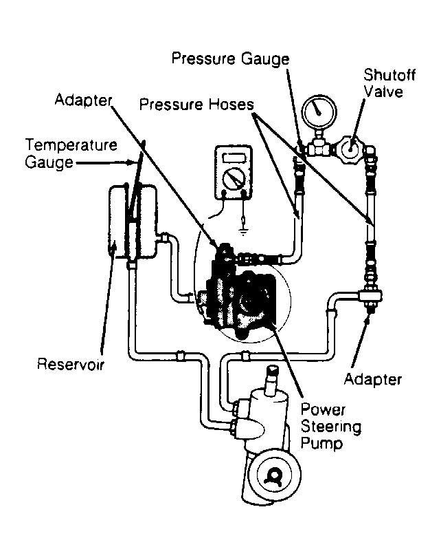 - Power steering pressure switch is located on side of power steering pump. Disconnect power steering pressure hose from power steering pump and connect in series a pressure gauge shutoff valve assembly capable of handling 250 psi (17.5 kg/cm2